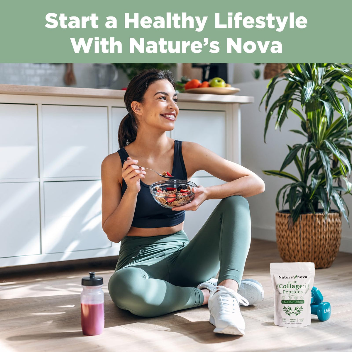 Discover the benefits of Nature's Nova Multi Collagen Peptides Powder. This unflavored blend of Type I, II, III, V, X collagen with Biotin, Hyaluronic Acid, and Vitamin C dissolves easily, offering a non-GMO solution for skin, hair, and joint health.