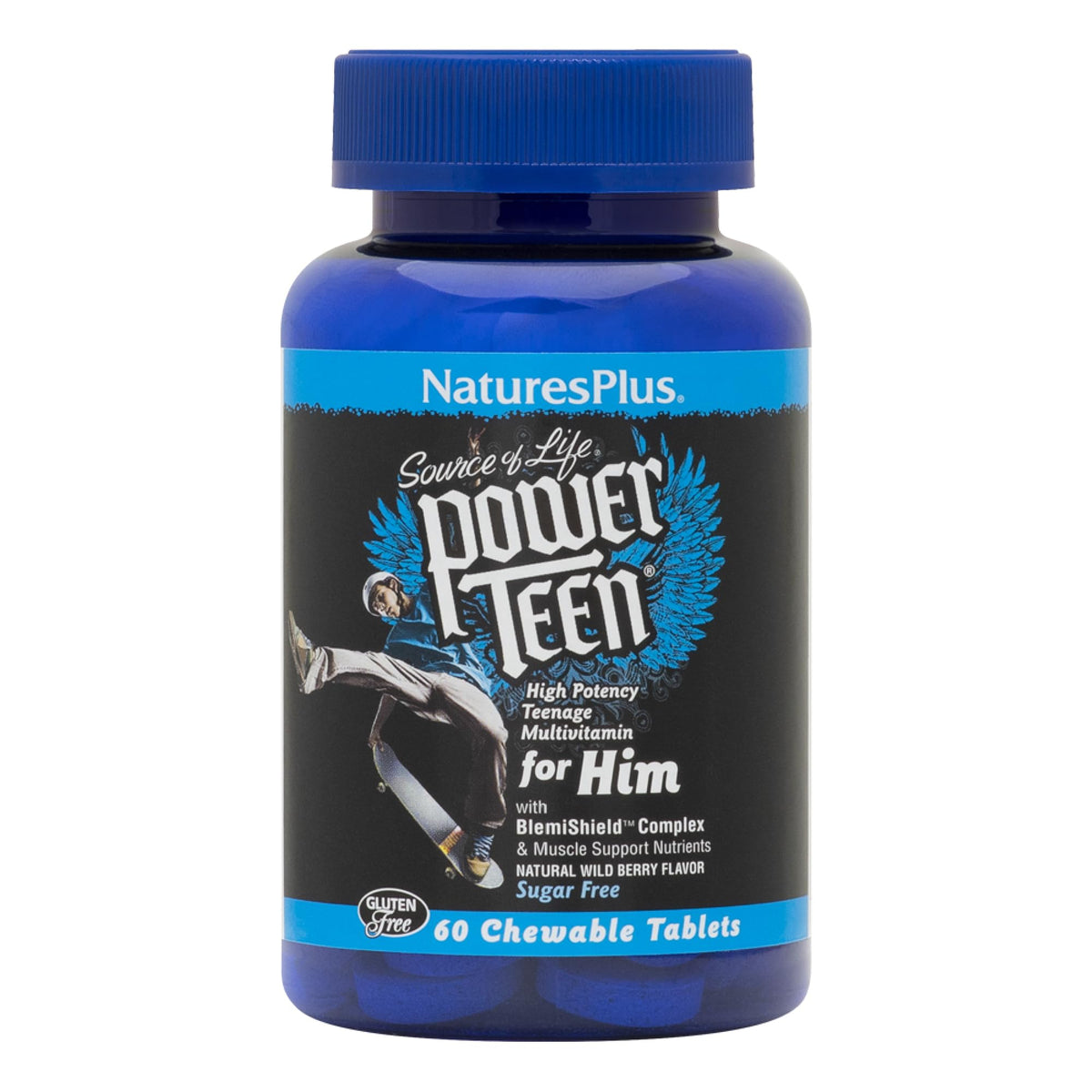 Natures Plus Source of Life Power Teen for Him is a high-potency teenage multivitamin in delicious wild berry flavor. These chewable tablets provide essential nutrients for teen boys' growth and development.