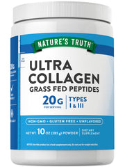 Nature's Truth Collagen Peptides Powder is an unflavored supplement made from grass-fed collagen types 1 & 3. This keto-friendly powder easily mixes into your favorite beverages and provides essential nutrients for skin, hair, and joint health. It is a non-GMO and gluten-free formula suitable for daily use.