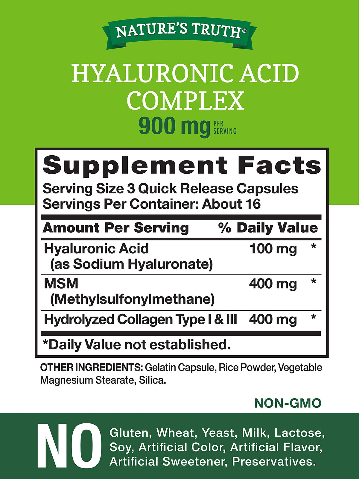Nature's Truth Hyaluronic Acid with Collagen & MSM | 900mg | 50 Capsules | Non-GMO & Gluten Free Supplement