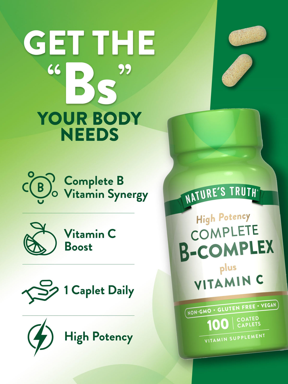 Nature's Truth Vitamin B Complex Plus Vitamin C | 100 Caplets | Vegan, Non-GMO & Gluten Free Supplement
