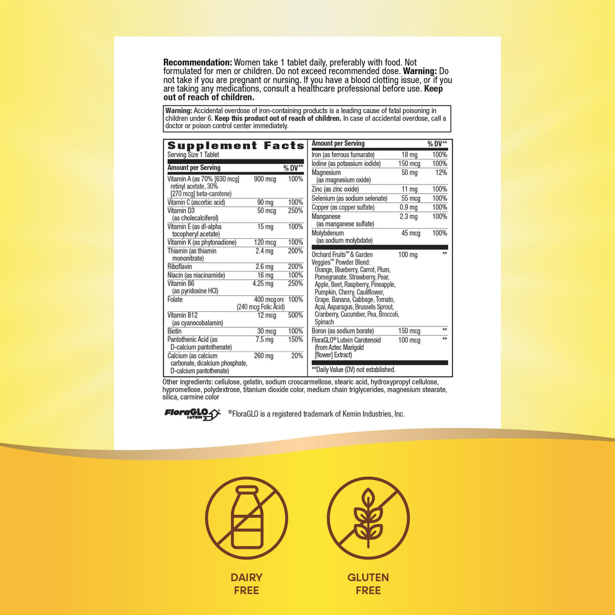 Ingredients :: Vitamin A (as 70% 630 mcg retinyl acetate and 30% 270 mcg beta carotene); Vitamin C (ascorbic acid); Vitamin D3 (as cholecalciferol); Vitamin E (as dl-alpha tocopheryl acetate); Vitamin K (as phytonadione); Thiamin (as thiamin mononitrate); Riboflavin; Niacin (as niacinamide); Vitamin B6 (as pyridoxine HCl); Folate (240 mcg Folic Acid); Vitamin B12 (as cyanocobalamin); Biotin; Pantothenic Acid (as D-calcium pantothenate); Calcium (as calcium carbonate, D-calcium pantothenate, dicalcium phosphate); Iron (as ferrous fumarate); Magnesium (as magnesium oxide); Zinc (as zinc oxide); Copper (as copper sulfate); Manganese (as manganese sulfate); Orchard Fruits & Garden Veggies Powder Blend Blueberry, Orange, Carrot, Pomegranate, Plum, Straw- berry, Apple, Beet, Pear, Tomato, Raspberry, Broccoli, Cherry, Spinach, Cauliflower, Grape, Aa, Asparagus, Banana, Brussels Sprout, Cabbage, Cranberry, Cucumber, Pea, Pineapple, Pumpkin; Boron (as sodium borate); Lutein Carotenoid from FloraGLO Aztec Marigold Extract (flower); Cellulose; Sodium Croscarmellose; Gelatin; Stearic Acid; Hydroxypropyl Cellulose; Magnesium Stearate; Hypromellose; Polydextrose; Titanium Dioxide Color; Silica; Medium Chain Triglycerides; Carmine Color