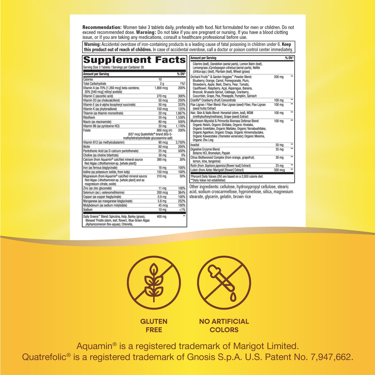Ingredients :: Vitamin A (as 70% 1,260 mcg beta carotene and 30% 540 mcg retinyl acetate); Vitamin C (ascorbic acid); Vitamin D3 (as cholecalciferol); Vitamin E (as d-alpha tocopheryl succinate); Vitamin K (as phytonadione); Thiamin (as thiamin mononitrate); Riboflavin; Niacin (as niacinamide); Vitamin B6 (as pyridoxine HCl); Folate (837 mcg Quatrefolic® brand (6S)-5-Methyltetrahydrofolate glucosamine salt); Vitamin B12 (as methylcobalamin); Biotin; Pantothenic Acid (as D-calcium pantothenate); Choline (as choline bitartrate); Calcium (from Aquamin® calcified mineral source Red Algae Lithothamnion sp. whole plant); Iron (as ferrous bisglycinate chelate); Iodine (as potassium iodide and from kelp); Magnesium (from Aquamin® calcified mineral source Red Algae Lithothamnion sp. whole plant and as magnesium citrate, oxide); Zinc (as zinc gluconate); Selenium (as L-selenomethionine); Copper (as copper bisglycinate chelate); Manganese (as manganese bisglycinate chelate); Daily Greens™ Blend: Spirulina, Kelp, Barley (grass), Blessed Thistle (stem, leaf, flower), Blue-Green Algae (Aphanizomenon flos-aquae), Chlorella (micro-algae), Cilantro (leaf), Dandelion (aerial parts), Lemon Balm (leaf), Lemongrass (Cymbopogon citratus) (aerial parts), Nettle (Urtica spp.) (leaf), Plantain (leaf), Wheat (grass); Orchard Fruits™ / Garden Veggies™ Powder Blend: Blueberry, Orange, Carrot, Pomegranate, Plum, Strawberry, Apple, Beet, Cherry, Pear, Tomato, Cauliflower, Raspberry, Açaí, Asparagus, Banana, Broccoli, Brussels Sprout, Cabbage, Cranberry, Cucumber, Grape, Pea, Pineapple, Pumpkin, Spinach; CranRx® Cranberry fruit concentrate; Flax Lignan / Fiber Blend: Flax Lignan Fiber (seed), Flax Lignan Extract (seed hulls); Hair, Skin & Nails Blend: Horsetail Grass (aerial parts), MSM (methylsulfonylmethane), Grape Seed Extract; Mushroom Mycelial & Primordia Biomass Defense Blend: Organic Reishi (Ganoderma lucidum), Organic Shiitake (Lentinula edodes), Organic Oyster Hiratake (Pleurotus ostreatus), Organic Enokitake (Flammulina velutipes), Organic Maitake (Grifola frondosa), Organic Yamabushitake (Hericium erinaceus), Organic Agarikon (Fomitopsis officinalis), Organic Chaga (Inonotus obliquus), Organic Himematsutake (Agaricus brasiliensis/blazei), Organic Kawaratake (Trametes versicolor), Organic Mesima (Phellinus linteus), Organic Zhu Ling (Grifola umbellata); Inositol; Digestive Enzyme Blend: Betaine HCl, Bromelain, Papain; Citrus Bioflavonoid Complex (from orange, grapefruit, lemon, lime, tangerine); Rutin (from Sophora japonica) (flower bud) Extract; Lutein (from Aztec marigold Extract) (flower); Cellulose; Hydroxypropyl Cellulose; Stearic Acid; Sodium Croscarmellose; Hypromellose; Silica; Magnesium Stearate; Glycerin; Gelatin; Brown Rice