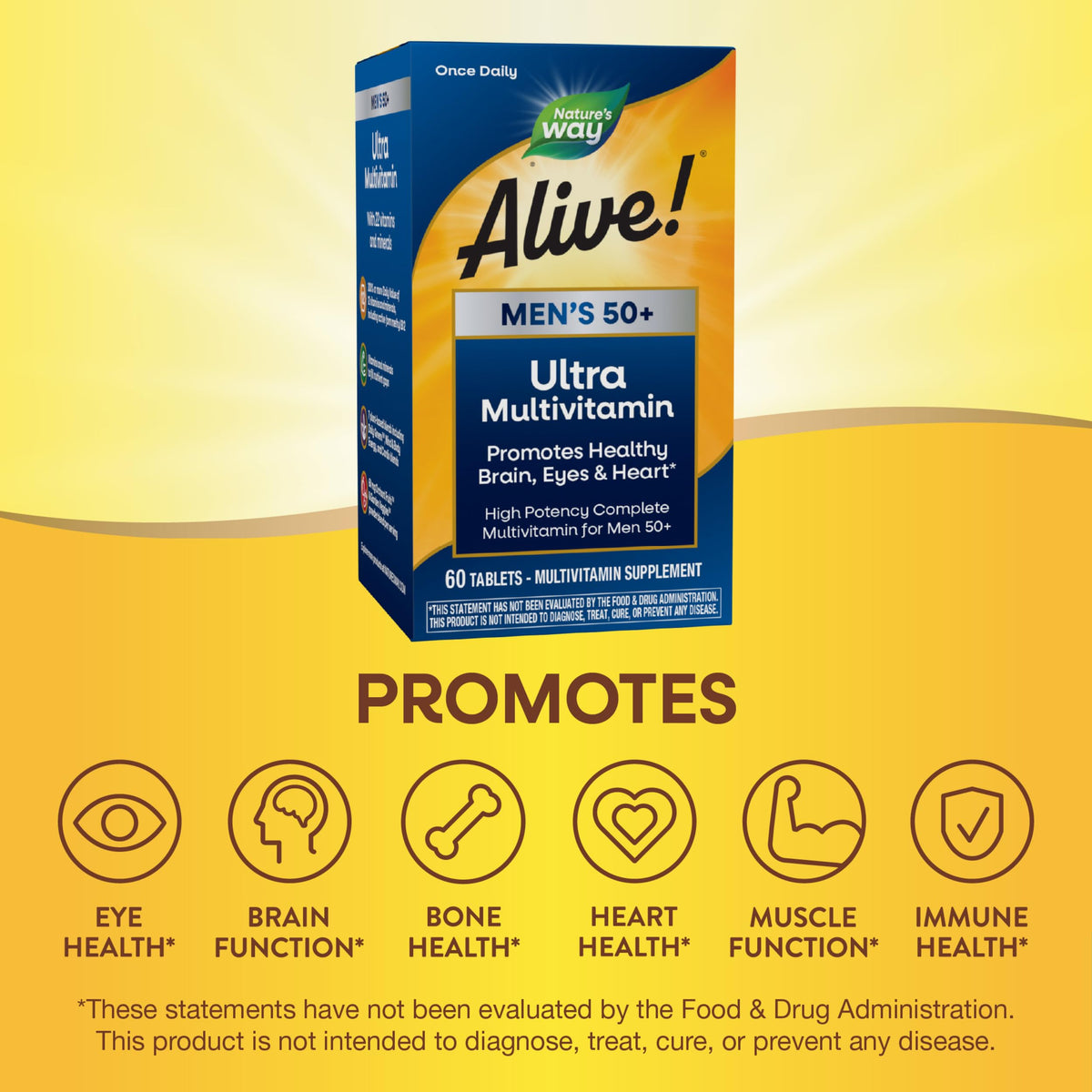 Nature's Way Alive! Men’s 50+ Daily Ultra Multivitamin, High Potency Formula, Supports Healthy Brain, Eyes & Heart*, with Methylated B12, Gluten-Free, 60 Tablets (Packaging May Vary)