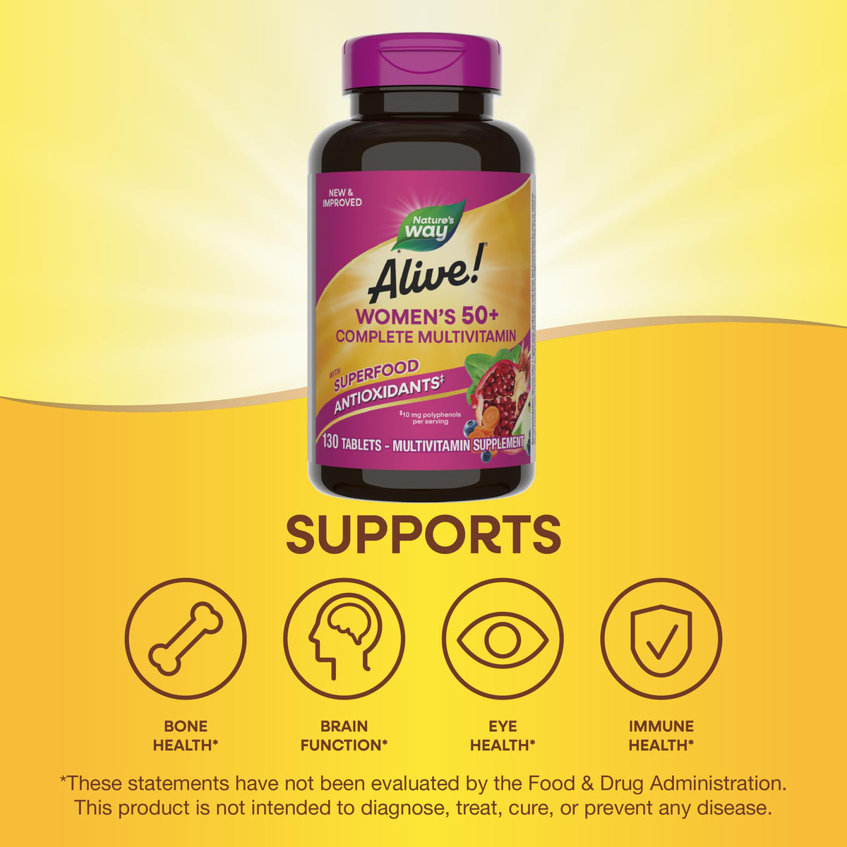 Nature's Way Alive! Women's 50+ Complete Multivitamin, Supports Healthy Heart, Brain, Bones*, Superfood Antioxidants**, B-Vitamins, Gluten Free, 130 Tablets (Packaging May Vary)