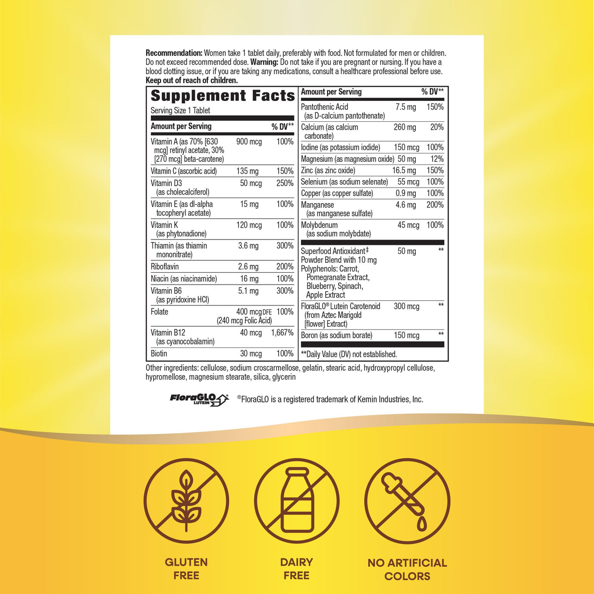 Ingredients :: Vitamin A (as 70% 630 mcg retinyl acetate and 30% 270 mcg beta carotene); Vitamin C (ascorbic acid); Vitamin D3 (as cholecalciferol); Vitamin E (as dl-alpha tocopheryl acetate); Vitamin K (as phytonadione); Thiamin (as thiamin mononitrate); Riboflavin; Niacin (as niacinamide); Vitamin B6 (as pyridoxine HCl; Folate (240 mcg Folic Acid); Vitamin B12 (as cyanocobalamin); Biotin; Pantothenic Acid (as D-calcium pantothenate); Calcium (as calcium carbonate, dicalcium phosphate, D-calcium pantothenate); Iodine (as potassium iodide); Magnesium (as magnesium oxide); Zinc (as zinc oxide); Copper (as copper sulfate); Manganese (as manganese sulfate); Orchard Fruits™ & Garden Veggies™ Powder Blend: Blueberry, Orange, Carrot, Pomegranate, Plum, Strawberry, Apple, Beet, Pear, Tomato, Raspberry, Broccoli, Cherry, Spinich, Cauliflower, Grape, Açaí, Asparagus, Banana, Brussels Sprout, Cabbage, Cranberry, Cucumber, Pea, Pineapple, Pumpkin; FloraGLO® Lutein Carotenoid from Aztec Marigold Extract (flower); Boron (as sodium borate); Cellulose; Sodium Croscarmellose; Gelatin; Stearic Acid; Hydroxypropyl Cellulose; Magnesium Stearate; Hypromellose; Polydextrose; Titanium Dioxide Color; Silica; Medium Chain Triglycerides; Carmine Color