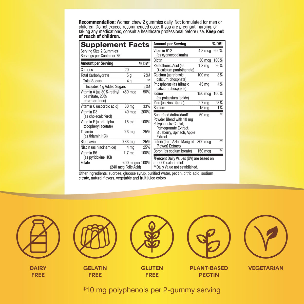 Ingredients :: Vitamin A (as retinyl palmitate); Vitamin C (ascorbic acid); Vitamin D3 (as cholecalciferol); Vitamin E (as dl-alpha tocopherol acetate); Thiamin (as thiamin HCl); Riboflavin; Niacin (as niacinamide); Vitamin B6 (as pyridoxine HCl); Folate (240 mcg Folic Acid); Vitamin B12 (as cyanocobalamin); Biotin; Pantothenic Acid (as D-calcium pantothenate); Calcium (as tricalcium phosphate); Phosphorus (as tricalcium phosphate); Iodine (as potassium iodide); Zinc (as zinc citrate); Orchard Fruits™ & Garden Veggies™ Powder Blend: Orange, Blueberry, Carrot, Plum, Pomegranate, Strawberry, Pear, Apple, Beet, Raspberry, Pineapple, Pumpkin, Cherry, Cauliflower, Grape, Banana, Cabbage, Tomato, Açaí, Asparagus, Brussels Sprout, Cranberry, Cucumber, Pea, Broccoli, Spinach; Lutein (from Aztec Marigold Extract) (flower); Boron (as sodium borate); Sugar; Glucose Syrup; Purified Water; Pectin; Citric Acid; Sodium Citrate; Natural Flavors; Vegetable And Fruit Juice Colors; Coconut Oil; Carnauba Wax
