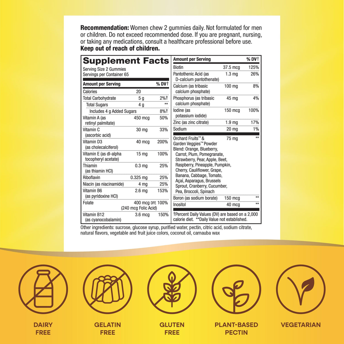 Ingredients :: Vitamin A (as retinyl palmitate); Vitamin C (ascorbic acid); Vitamin D3 (as cholecalciferol); Vitamin E (as dl-alpha tocopheryl acetate); Thiamin (as thiamin HCl); Riboflavin; Niacin (as niacinamide); Vitamin B6 (as pyridoxine HCl); Folate (240 mcg Folic Acid); Vitamin B12 (as cyanocobalamin); Biotin; Pantothenic Acid (as calcium D-pantothenate); Calcium (as tricalcium phosphate; Phosphorus (as tricalcium phosphate; Iodine (as potassium iodide); Zinc (as zinc citrate); Orchard Fruits™ & Garden Veggies™ Powder Blend: Orange, Blueberry, Carrot, Plum, Pomegranate, Strawberry, Pear, Apple, Beet, Raspberry, Pineapple, Pumpkin, Cherry, Cauliflower, Grape, Banana, Cabbage, Tomato, Açaí, Asparagus, Brussels Sprout, Cranberry, Cucumber, Pea, Broccoli, Spinach; Boron (as sodium borate); Inositol; Sucrose; Glucose Syrup; Purified Water; Pectin; Citric Acid; Sodium Citrate; Natural Flavors; Vegetable And Fruit Juice Colors; Coconut Oil; Carnauba Wax