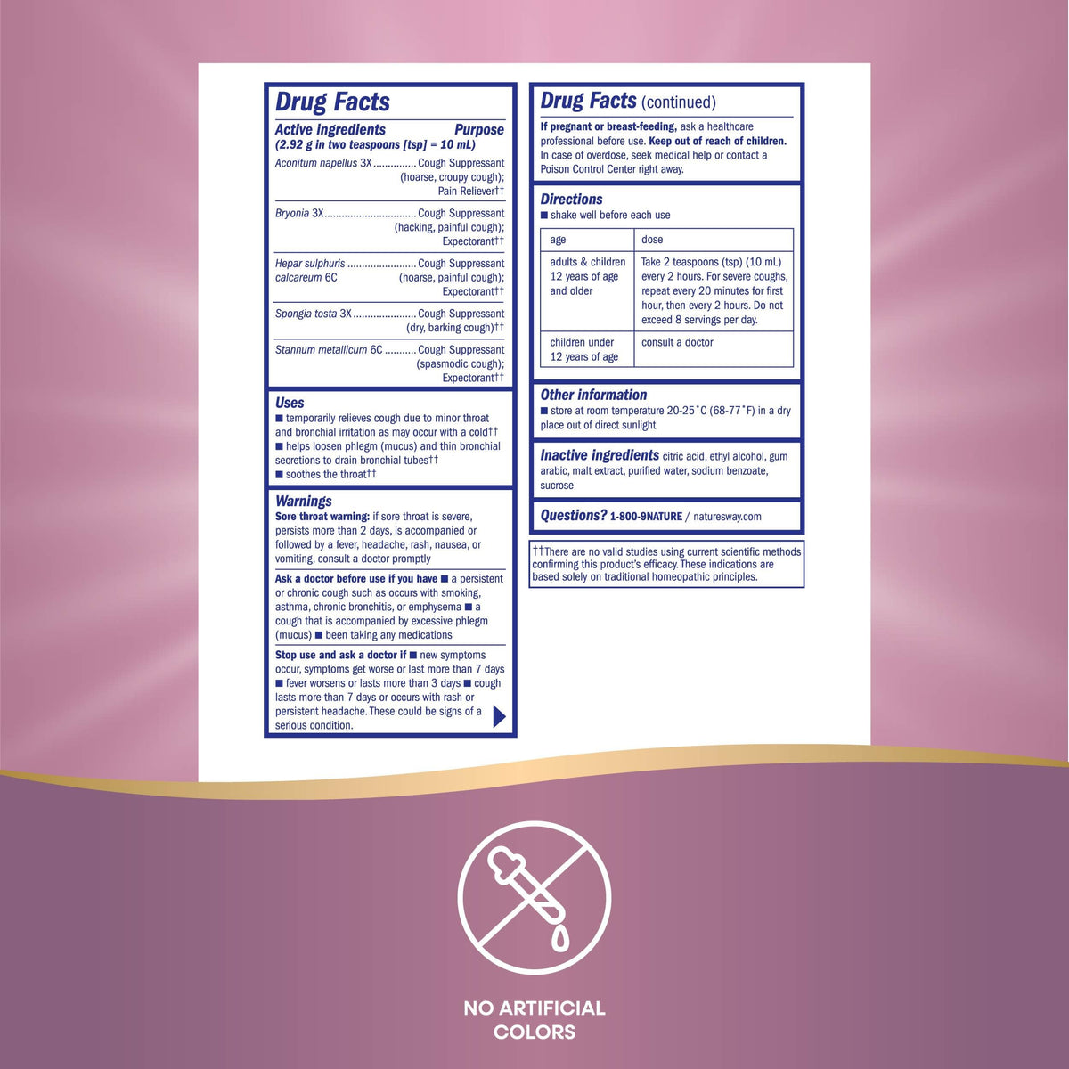 Full Ingredients List: Aconitum napellus 3X, Bryonia 3X, Hepar sulphuriscalcareum 6C, Spongia tosta 3X, Stannum metallicum 6C / citric acid, ethyl alcohol, gum arabic, malt extract, purified water, sodium benzoate, sucrose