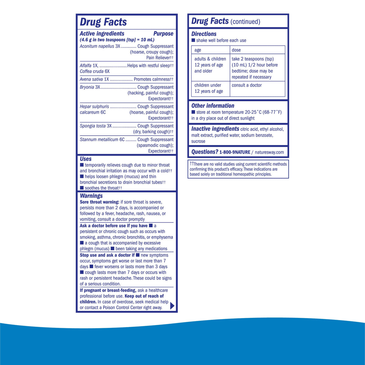 Ingredients :: Active ingredients (4.6 g in two teaspoons (tsp) = 10 mL) Purpose; Aconitum napellus 3X Cough Suppressant (hoarse, croupy cough); Pain Reliever; Alfalfa 1X Coffea cruda 6X Helps with restful sleep; Avena sativa 1X Promotes calmness; Bryonia 3X Cough Suppressant (hacking, painful cough); Expectorant ; Hepar sulphuris calcareum 6C Cough Suppressant (hoarse, painful cough); Expectorant ; Spongia tosta 3X Cough Suppressant (dry, barking cough) ; Stannum metallicum 6C Cough Suppressant (spasmodic cough); Expectorant ; Citric Acid; Ethyl Alcohol; Malt Extract; Purified Water; Sodium Benzoate; Sucrose