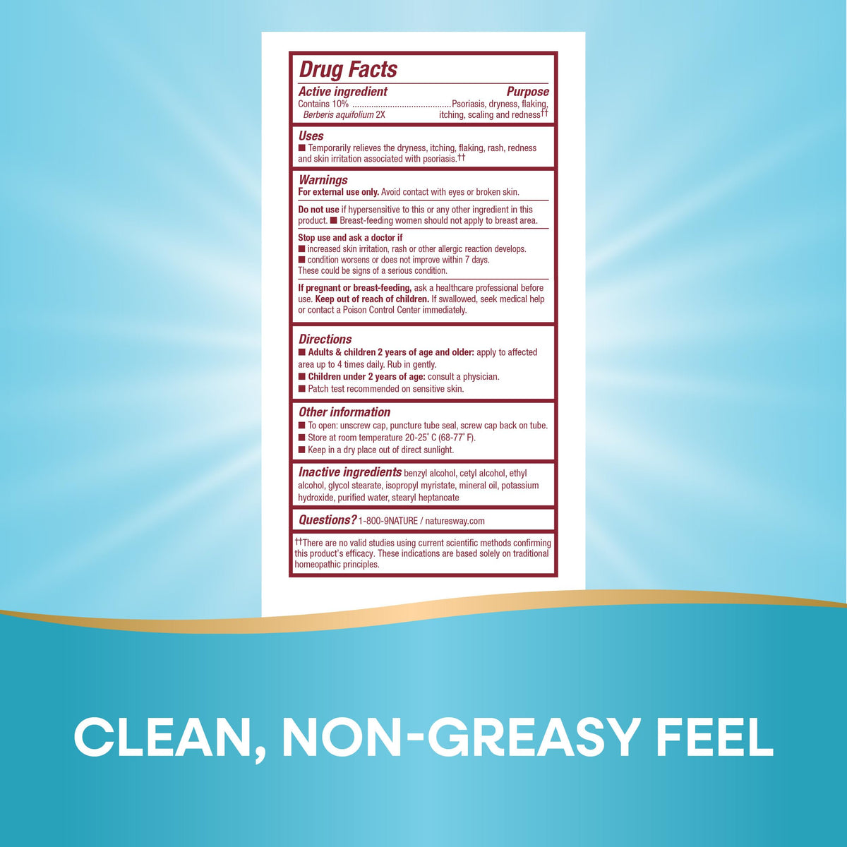 Key Ingredients: Contains 10% Berberis aquifolium 2X, benzyl alcohol, cetyl alcohol, glycol stearate, isopropyl myristate, mineral oil, potassium hydroxide, purified water, stearyl heptanoate.