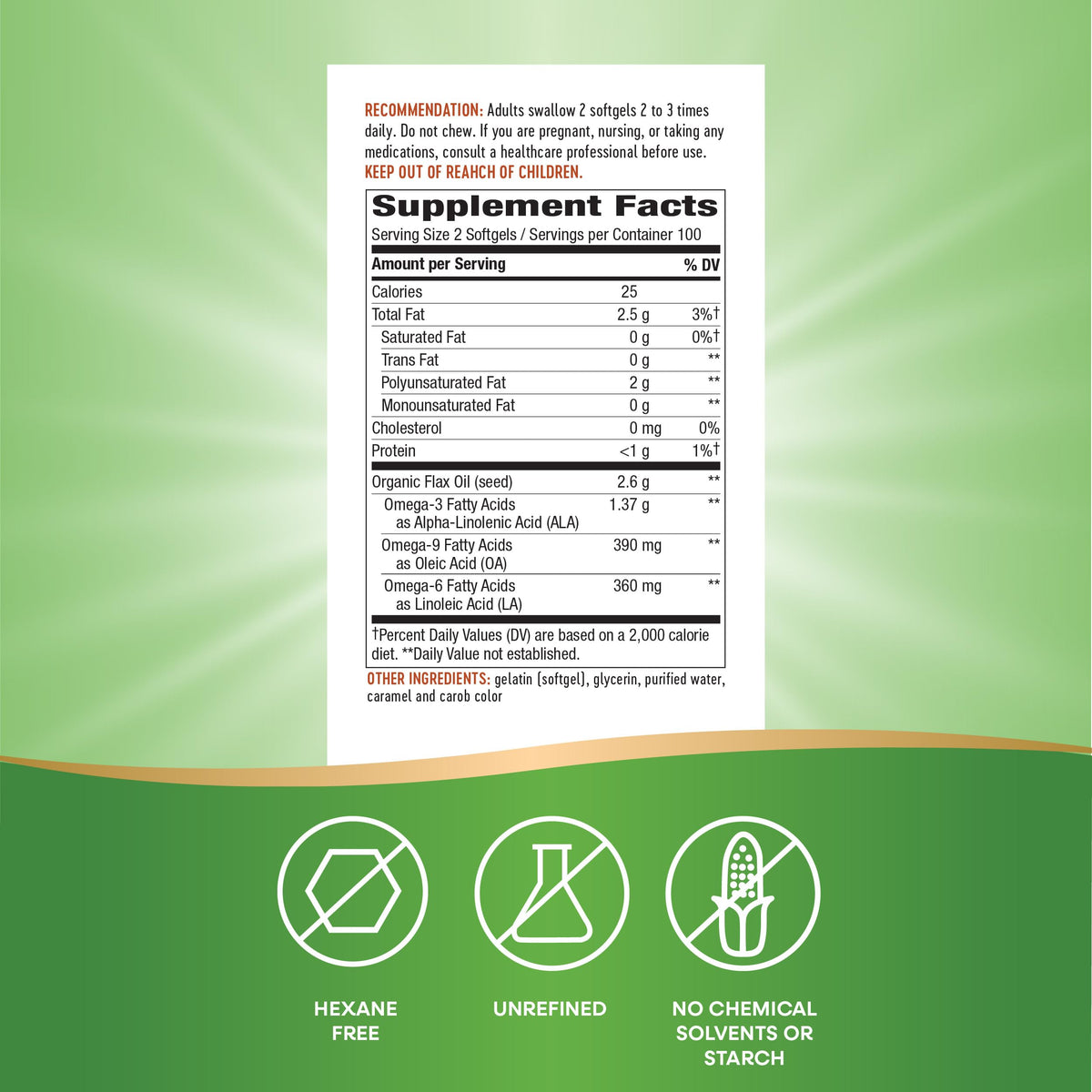 Ingredients: Organic Flax Oil seed Omega3 Fatty Acids as AlphaLinolenic Acid ALA Omega9 Fatty Acids as Oleic Acid OA Omega6 Fatty Acids as Linoleic Acid LA Gelatin Softgel Glycerin Purified Water Caramel And Carob Color
