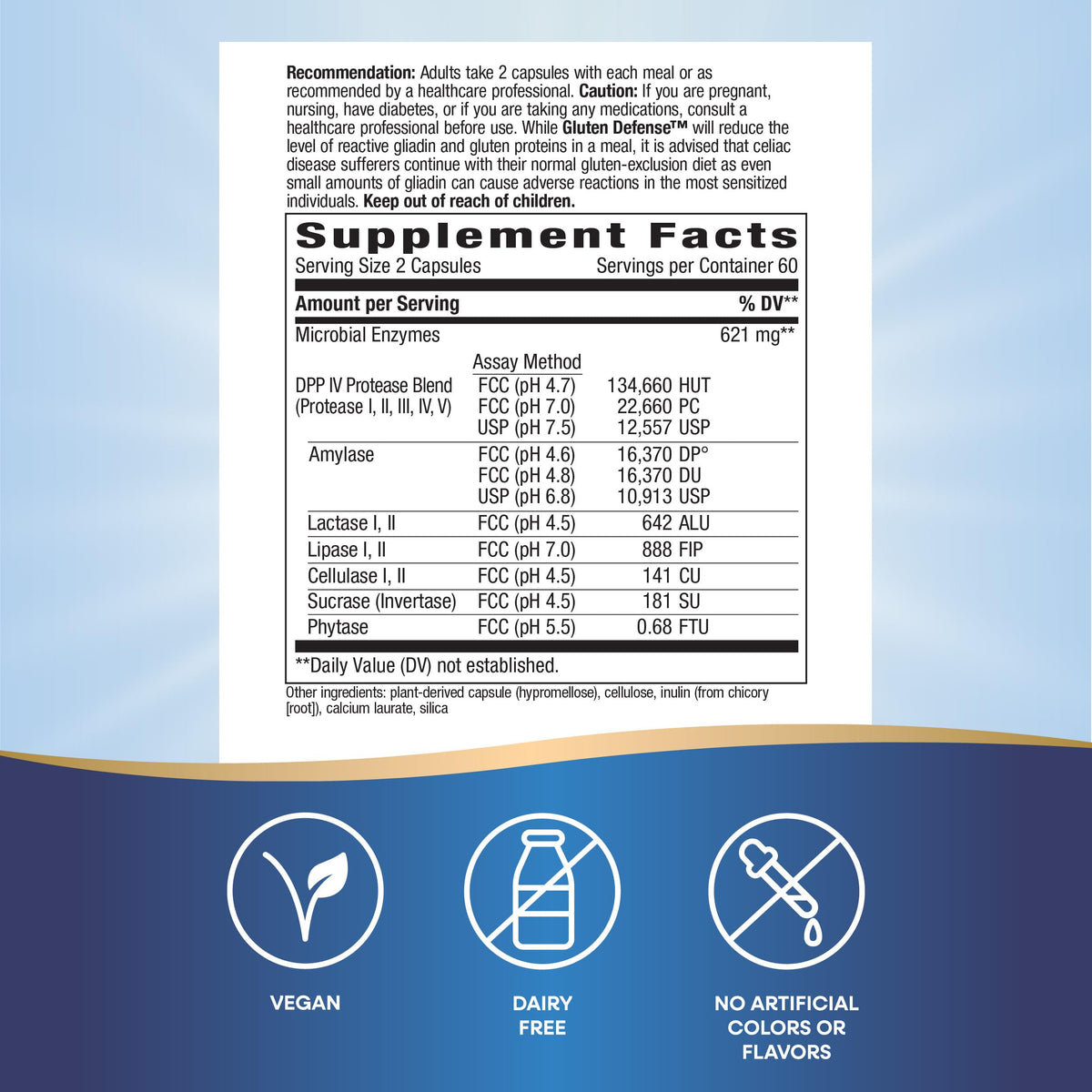| specific uses for product | Why are gluten and casein a concernBecause some individuals experience digestive discomfort when they eat foods with these proteins even when they try to avoid obvious sourcesFor some, gluten and casein can be the cause of occasional gas, bloating, and indigestion. However, the right digestive enzymes can make a difference when trying to support a gluten free and casein free lifestyle.Why take Gluten DefenseGluten Defense is specifically formulated to defend against glutenGluten and casein are found where youd never expect them salad dressings, cold cuts even toothpaste Gluten Defense features DPP IV dipeptidyl peptidase activity, from a protease enzyme specific to digestion of gluten and casein.Gluten Defense also includes a complete range of digestive enzymesCompeting products only tackle gluten Gluten Defense helps you digest other proteins, fats and carbohydrates as well. |