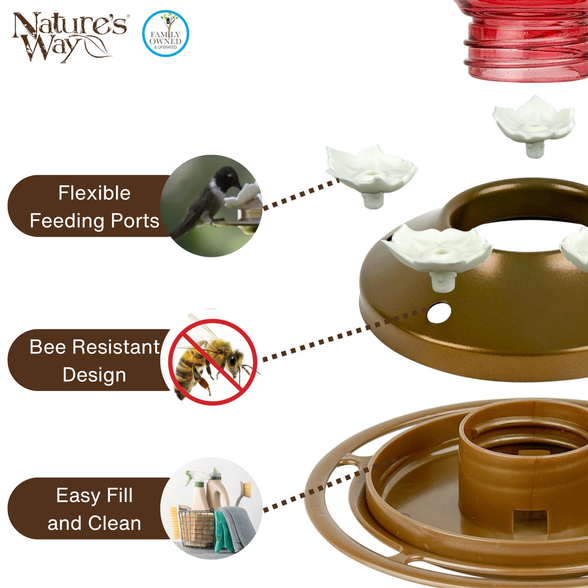Nature's Way Hanging Glass Hummingbird Feeder for Outdoor Decor, 25 Ounce Capacity Nectar Feeder, 5 Easy to Clean Flexible Ports, Red