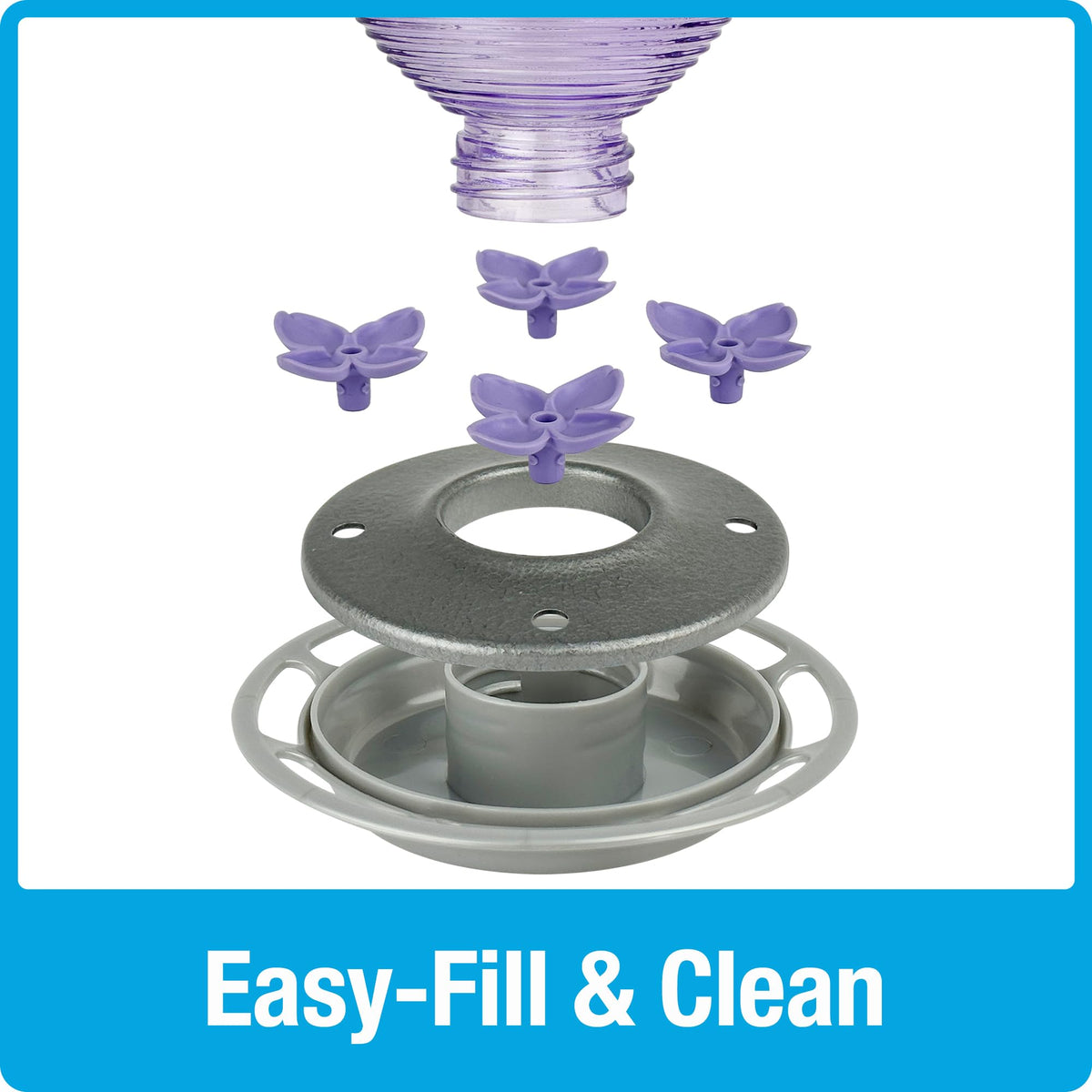 Nature's Way Hanging Glass Hummingbird Feeder for Outdoor Decor, 29 Ounce Capacity Nectar Feeder, 4 Easy to Clean Flexible Ports, Purple Lilac