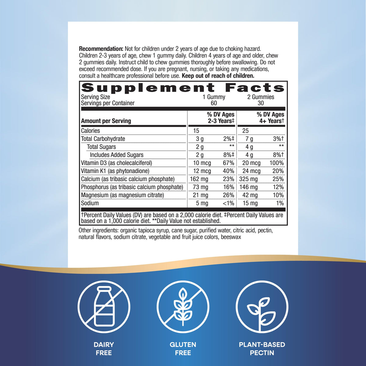 Ingredients :: Total Carbohydrate; Total Sugars; Includes Added Sugars; Vitamin D3 (as cholecalciferol); Vitamin K1 (as phytonadione); Calcium (as tricalcium phosphate; Phosphorus (as tricalcium phosphate); Magnesium (as magnesium citrate); Sodium; Organic Tapioca Syrup; Cane Sugar; Purified Water; Citric Acid; Pectin; Natural Flavors; Sodium Citrate; Vegetable And Fruit Juice Colors; Coconut Oil; Beeswax