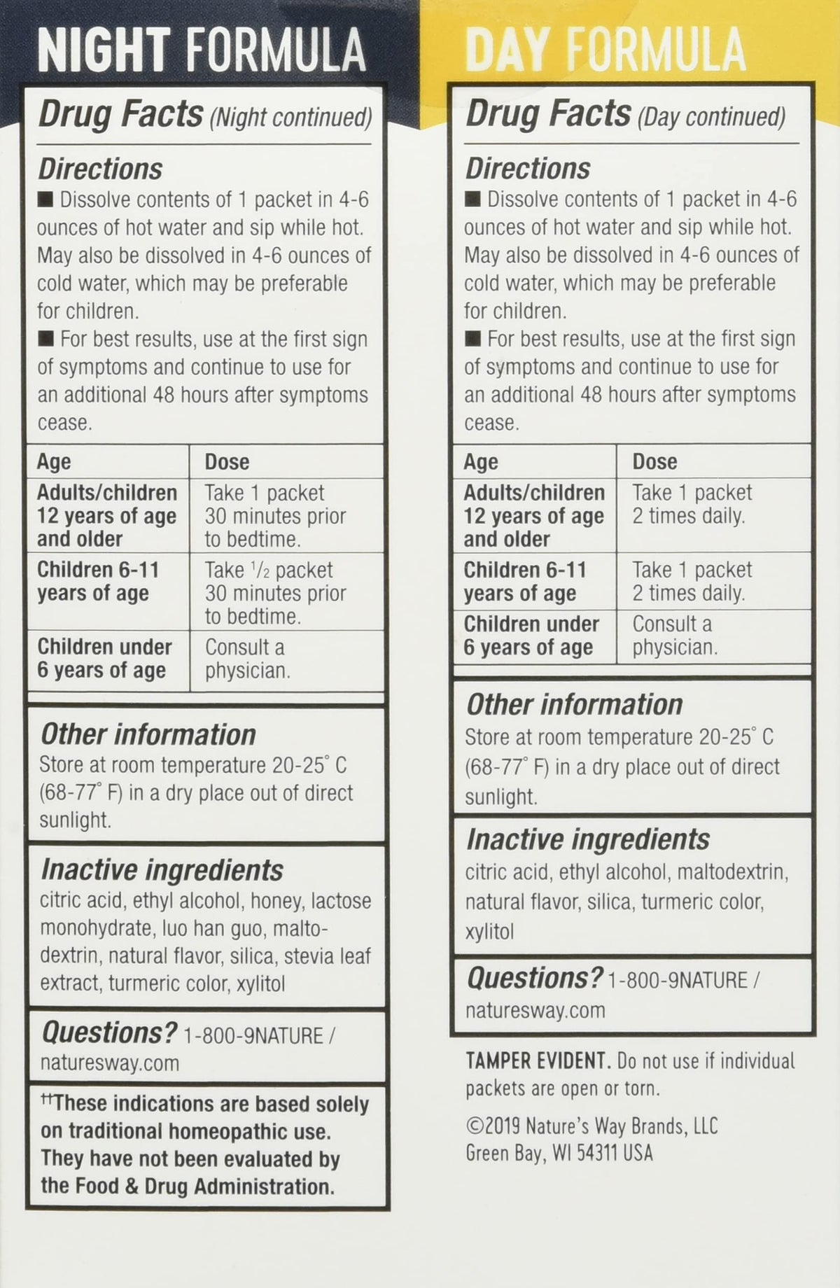 Directions :: Dissolve contents of 1 packet in 4-6 ounces of hot water and sip while hot. May also be dissolved in 4-6 ounces of cold water, which may be preferable for children. For best results, use at the first sign of symptoms and continue to use for an additional 48 hours after symptoms cease. Day Formula: Adults/children 12 years of age and older: Take 1 packet 2 times daily. Children 6-11 years of age: Take 1 packet 2 times daily. Children under 6 years of age: Consult a physician. Night Formula: Adults/children 12 years of age and older: Take 1 packet 30 minutes prior to bedtime. Children 6-11 years of age: Take packet 30 minutes prior to bedtime. Children under 6 years of age: Consult a physician.