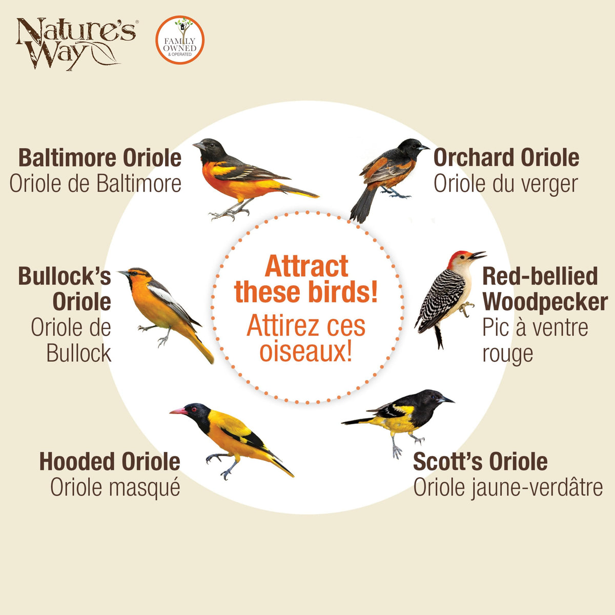 Hassle-free bird feeding with the Nature's Way Oriole Feeder. Serve multiple treats to attract orioles and keep them coming back for more. Offers a perfect mix of nectar, jelly, and fruit in one convenient feeder. Enjoy the beauty of nature in your own backyard!