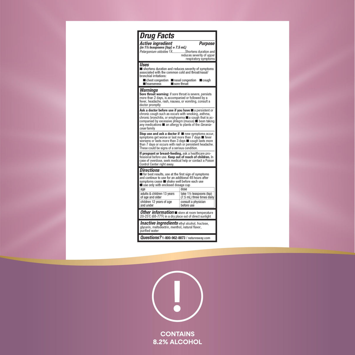 Ingredients :: Active ingredient (in 1 1/2 teaspoons (tsp) = 7.5 mL) Purpose; Pelargonium sidoides 1X Shortens duration & reduces severity of upper respiratory symptoms; Ethyl Alcohol; Fructose; Glycerin; Maltodextrin; Menthol; Natural Flavor; Purified Water