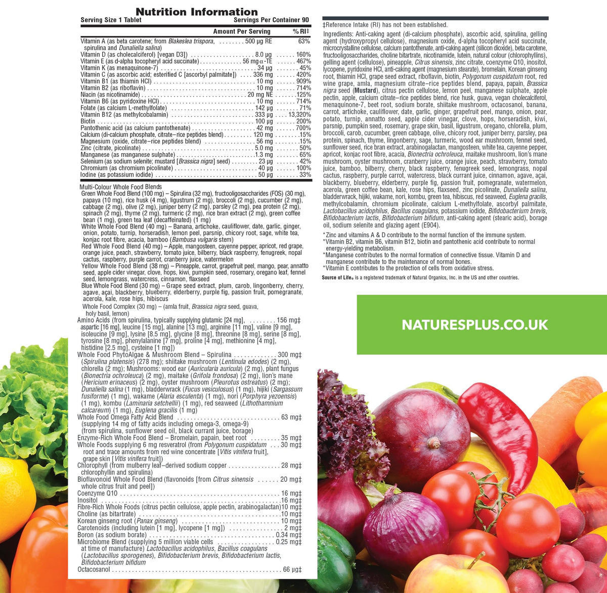 Ingredients :: Vitamin A (as beta carotene; from Blakeslea trispora, spirulina and Dunaliella salina: Potentiated by zeaxanthin, lutein, lycopene), Vitamin C as ascorbic acid; esterified C (ascorbyl palmitate) Organic Gold Standard, Vitamin D as vegan cholecalciferol (D3), Vitamin E (as d-alpha tocopheryl succinate), Vitamin K as menaquinone-4, menaquinone-7 (K2), Thiamin (as thiamine HCI; Organic Gold Standard), Riboflavin (as riboflavin; Organic Gold Standard), Niacin (as niacinamide; Organic Gold Standard), Vitamin B6 (as pyridoxine HCI; Organic Gold Standard), Folate (as calcium-L-5-methyltetrahydrofolate; Organic Gold Standard) (L-methylfolate), Vitamin B12 (as methylcobalamin), Biotin, Pantothenic Acid (as calcium pantothenate; Organic Gold Standard), Choline (as bitartrate), Calcium (as citrate, organic chelates from Spirulina platensis, di-calcium phosphate and from whole foods), lodine (from kelp, potassium iodide), Magnesium (as aminoate complex), Zinc (as aminoate complex, picolinate), Selenium (as aminoate complex), Copper (chlorophyllin; as aminoate complex), Manganese (as aminoate complex), Chromium (as aminoate complex), Whole Food PhytoAlgae & Organic Mushroom Blend Proprietary complex of spirulina algae (Spirulina platensis), fucaceae (Ascophyllum nodosum), red seaweed (Lithothamnium calcareum), dulse (Palmaria palmata), Irish moss (Chondrus crispus), laminaria brown algae (Laminaria digitata), bladderwrack (Fucus vesiculosus), hijiki (Sargassum fusiforme), wakame (Alaria esculenta), nori (Porphyra yezoensis), kombu (Laminaria setchellii); mushrooms: wood ear, Cordysim™ (Bionectria ochroleuca), maitake, shiitake, oyster mushroom, lion's mane, Whole Food Omega Fatty Acid & Prebiotic Fiber Blend Omega-3, Omega-9, and other healthful fatty acids (from spirulina, cellulose, chia, sunflower seed, black currant, borage, flax) fiber (from vegetable cellulose, citrus pectin cellulose).