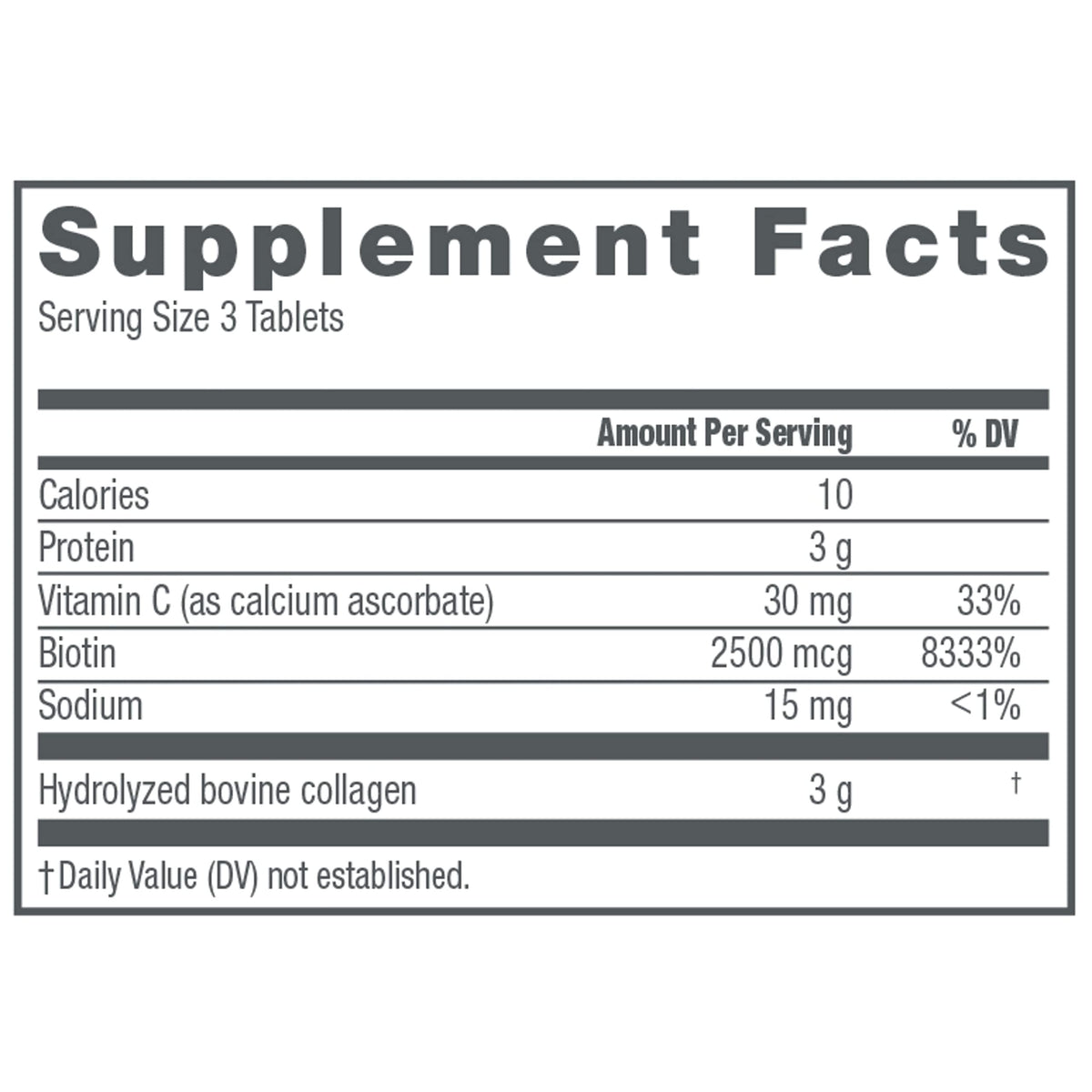 - BIOTIN AND VITAMIN C TABLETS: Collagen supplement with biotin to help support healthy hair and nails, plus essential vitamin C for antioxidant support and to promote healthy collagen formation (1)