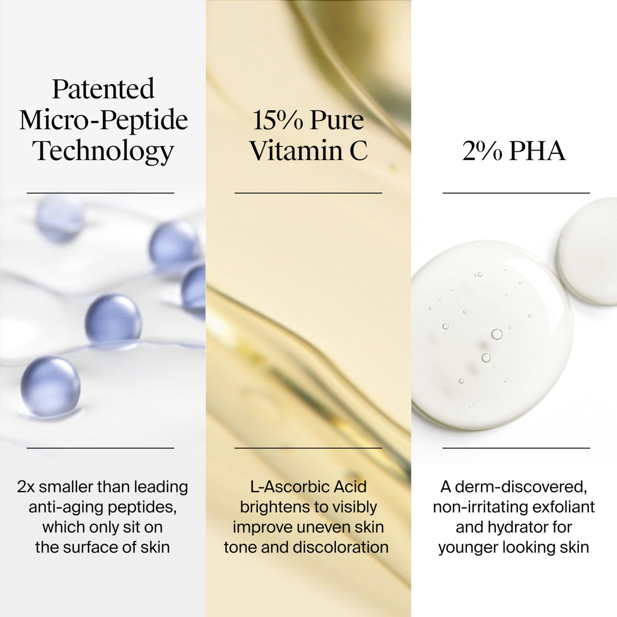 Ingredients :: Propanediol, Water, Ascorbic Acid, Gluconolactone, Acetyl Dipeptide-31 Amide, Chrysanthemum Parthenium (Feverfew) Extract, Hydrolyzed Collagen, Epigallocatechin Gallate, Caprylyl Glycol, Phenoxyethanol, Sodium Hydroxide