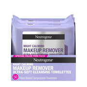 - Twin pack of two, 25-count packages of ultra-soft, pre-moistened Neutrogena Makeup Remover Night Calming Cleansing Face Wipes with superior, patented makeup removal and cleansing technology that removes up to 99% of dirt and impurities