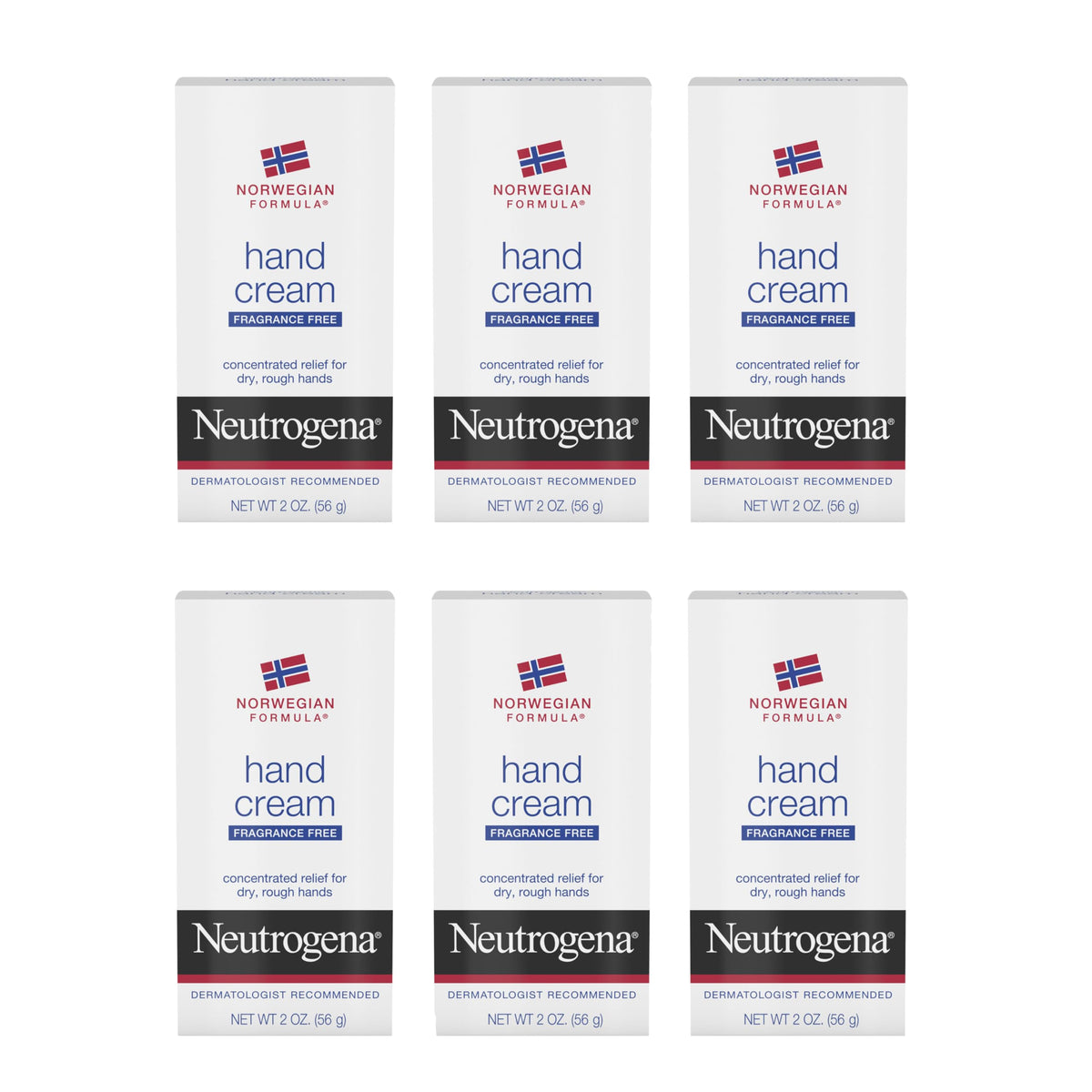 Neutrogena Norwegian Formula Hand Cream is a fragrance-free intensive lotion that hydrates dry, rough hands. This 2 oz pack of 6 is formulated with Glycerin to provide long-lasting moisture.