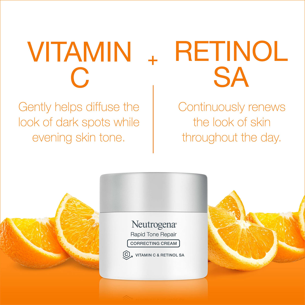 Experience the power of Neutrogena Rapid Tone Repair Retinol + Vitamin C Face Moisturizer, a dark spot corrector and anti-aging cream that visibly reduces wrinkles and fine lines. This dermatologist-recommended cream with vitamin C serum helps fade discoloration while hydrating with hyaluronic acid. Boost your skin's natural radiance with this fragrance-free formula!