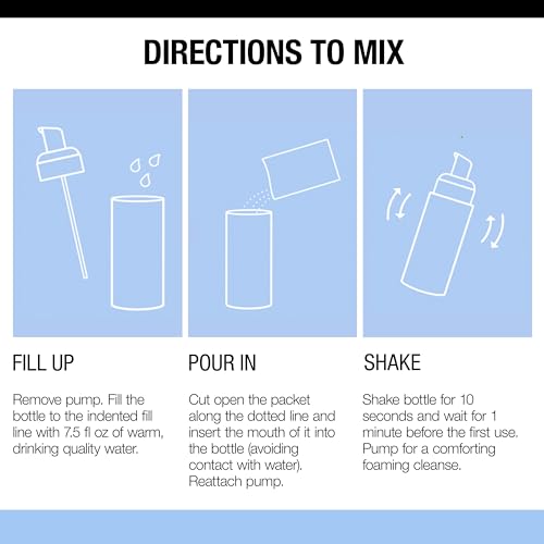 DIRECTION TO MIX FILL UP Remove pump. Fill the bottle to the indented fill line with 7.5 fl oz 221 mL of warm, drinking quality water. POUR IN Cut open the packet along the dotted line and insert the mouth of it into the bottle avoiding contact with water. To minimize dust, tap gently to empty the packet. Reattach pump. SHAKE Shake bottle for 10 seconds and wait for 1 minute before the first use. When finished, wash bottle according to carton instructions and fill with another concentrate refill DIRECTION FOR USE Wet face. Pump cleanser into hands. Massage face gently. Rinse. No need to shake. Questions 8005824048 Outside US, dial collect 2152738755. neutrogena.com