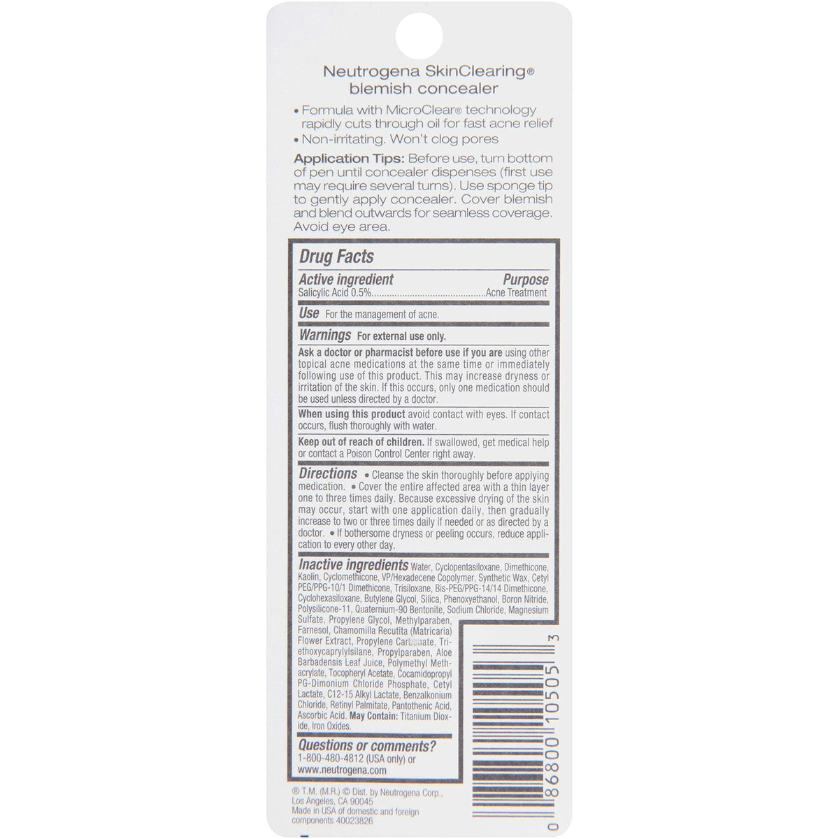- .05-ounces of Neutrogena SkinClearing Blemish Concealer Liquid Face Makeup with salicylic acid to help treat and prevent breakouts while covering up pimples