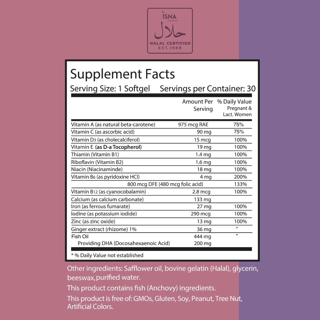 Ingredients: Vitamin A as Retinyl Palmitate, Vitamin C as Ascorbic Acid, Vitamin D as Cholecalciferol, Vitamin E as DaTocopherol, Vitamin B1as Thiamine HCl, Vitamin B2 as Ribofalvin, Niacin as Niacinaminde, Vitamin B6 as Pyridoxine HCl, Folic Acid, Vitamin B12 as Cyanocobalamin, Calcium as Calcium Carbonate, Iron as Ferrous Fumarate, Zinc as Zinc Oxide Docosahexaenoic Acid DHA, Eicosapentaenoic Acid EPA, Ginger Extract 1 rhizome, nonGMO, Beewax, Soybean Oil, Halal Bovine Gelatin, Glycerin, Purified Water, Caramel Color.