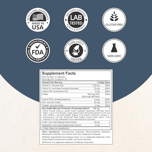 Ingredients: Vitamin C Ascorbic Acid, Vitamin E as DAlpha Tocopheryl Succinate, Vitamin B6 as Pyridoxine HCl, Folate, Vitamin B12 as Methylcobalamin, Zinc from Zinc Oxide, Copper as Cupric Oxide, Carrot Powder Daucus carota, Root, Eyebright Euphrasia officinalis, Aerial Parts, Lycium Fruit Powder, Grape Seed Extract Proanthocyanidins 23.75 mg Vitis vinifera, LCitrulline Malate, Bilberry Fruit Extract Vaccinium myrtillus L., Anthocyanins 1.25 m, BioPerine Black Pepper Extract Piper nigrum, Fruit Piperine 4.75 mg, Astaxanthin from Haematococcus pluvialis, Lutein from Aztec Marigold Flower Extract, Zeaxanthin from Aztec Marigold Flower Extract