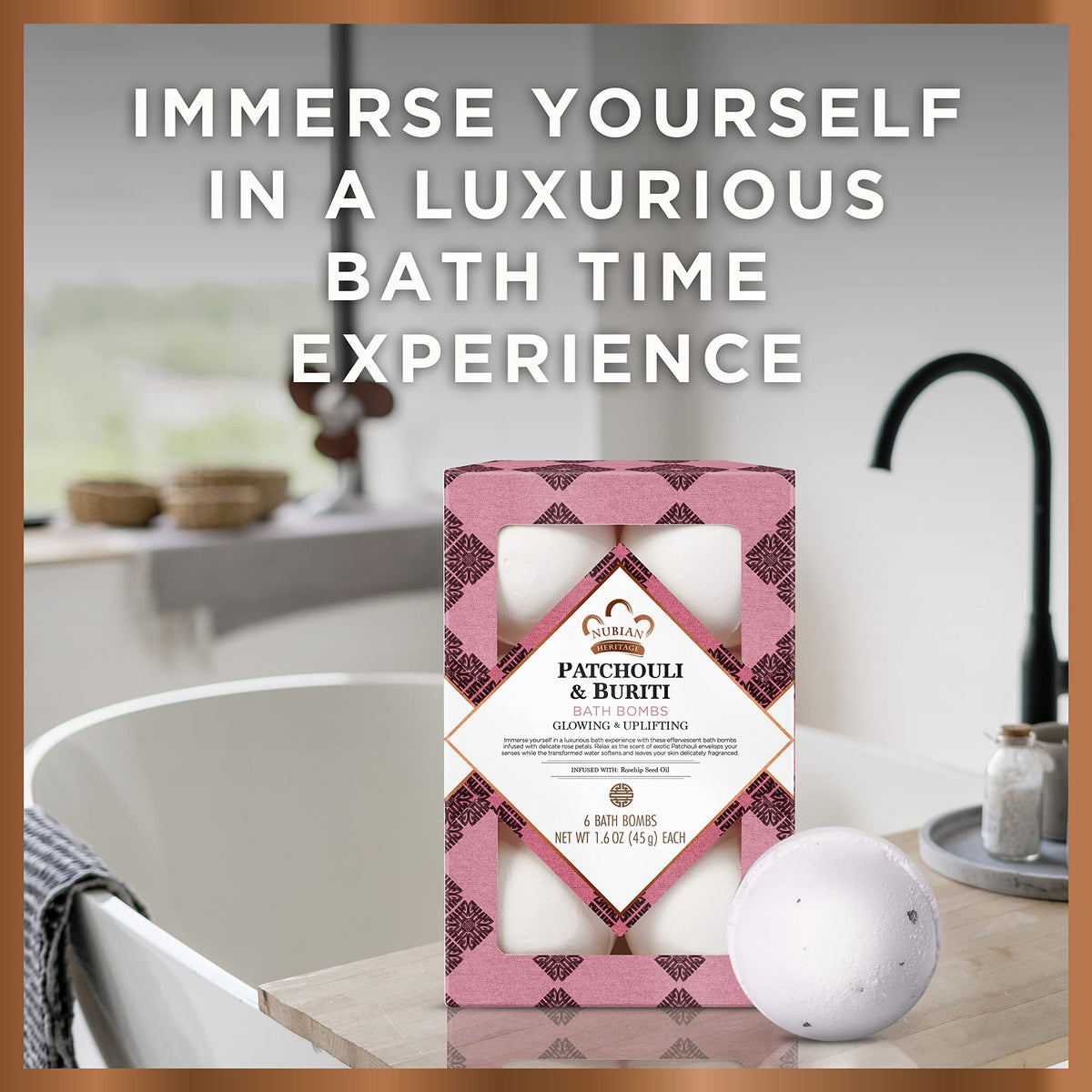 Nubian Heritage Bath Bombs in Patchouli & Buriti offer a luxurious bathing experience. Infused with Rose Hips, these bath bombs provide relaxation and skin nourishment.