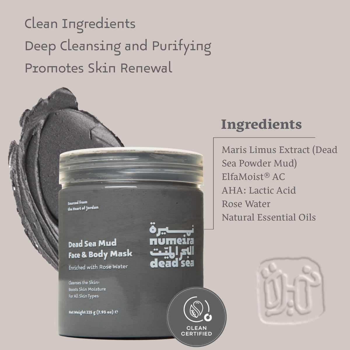 Active Ingredients :: Dead Sea Mud, Elfamoist (Acetamidoethoxyethanol), Rose Water, Lactic Acid, Jojoba oil, Fig seed oil