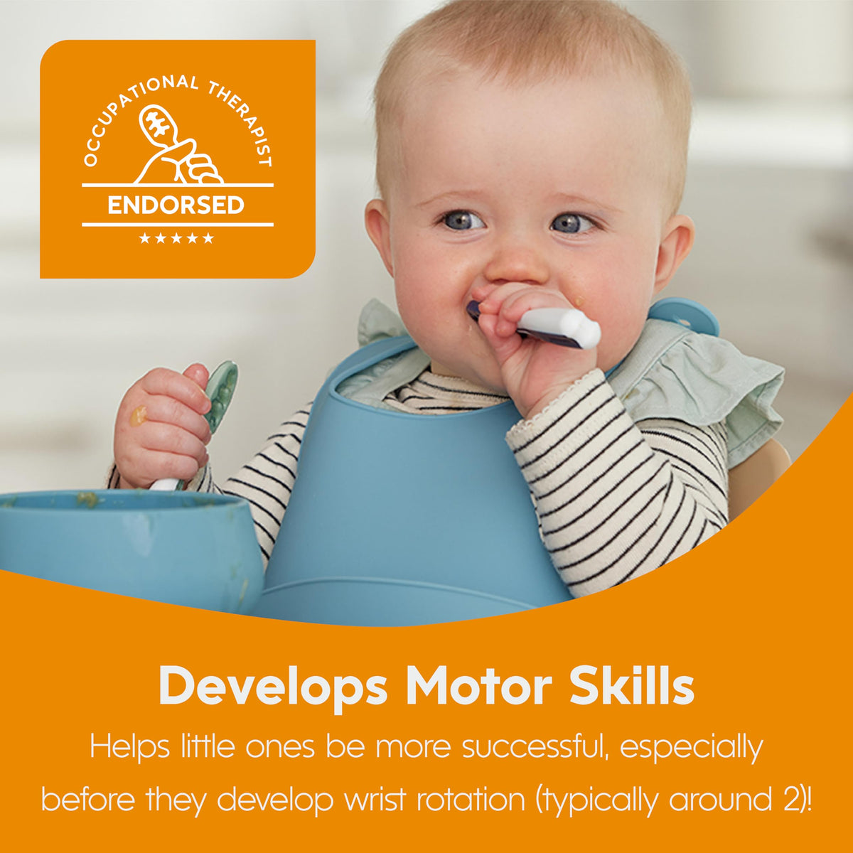 NumNum Baby Spoons Set offers essential pre-spoon GOOtensils for babies aged 6 months and above, perfect for self-feeding and baby-led weaning. These silicone toddler utensils in a 2 pack of gray and green are BPA-free and designed for easy feeding.