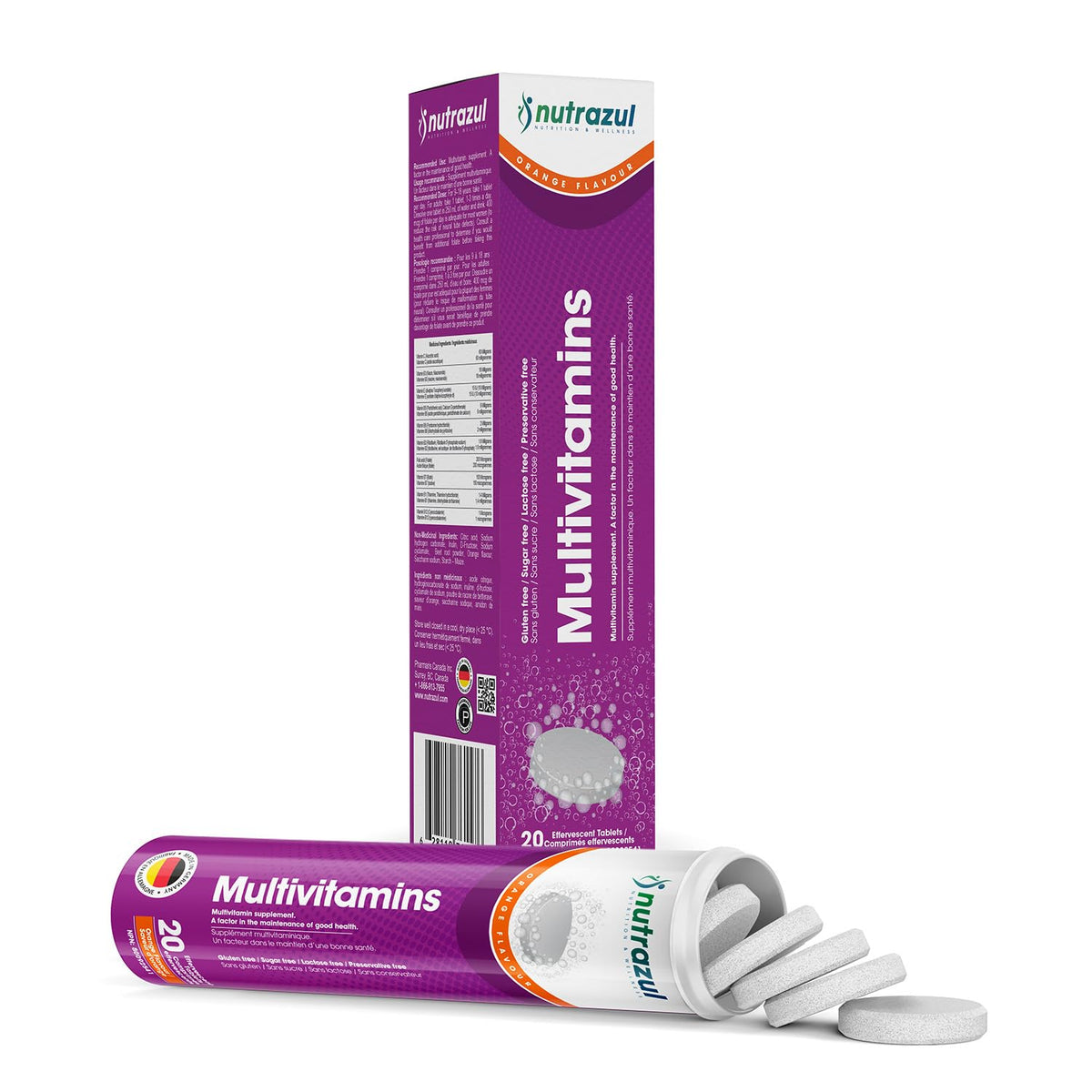nutrazul Multivitamin Effervescent Tablets provide immune support with 9 essential vitamins. These orange-flavored tablets are perfect for daily wellness for both adults and kids, offering a convenient and tasty way to stay healthy.