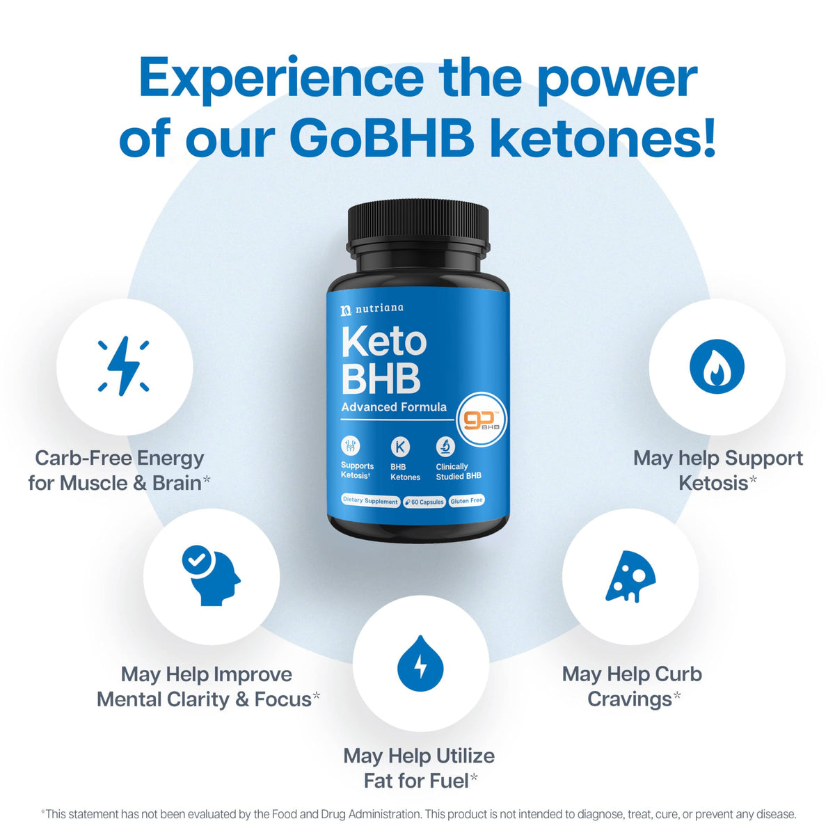 Elevate your keto lifestyle with Nutriana Keto BHB Exogenous Ketones. These keto pills offer mental clarity, focus, and carb-free energy support for men and women. Each bottle contains supplements designed to aid in muscle and ketosis support.