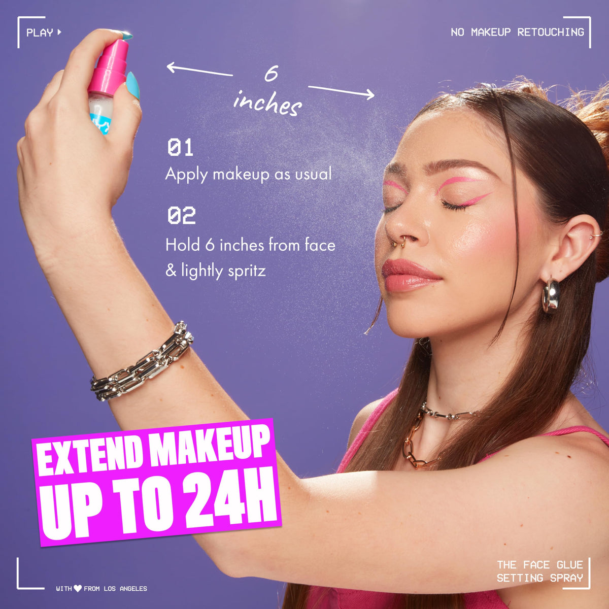 Short Product Description :: Don't just lock it down, GLUE it down with The Face Glue Setting Spray! This makeup gripping, transfer-resistant setting spray seals in your lewk for up to 24H wear. Waterproof, fade & transfer resistant while boosting color vibrancy upon application! This formula contains powerful film formers to glue down your makeup and Maple Syrup, known for its extreme gripping properties. Natural, lightweight finish with no stickiness!