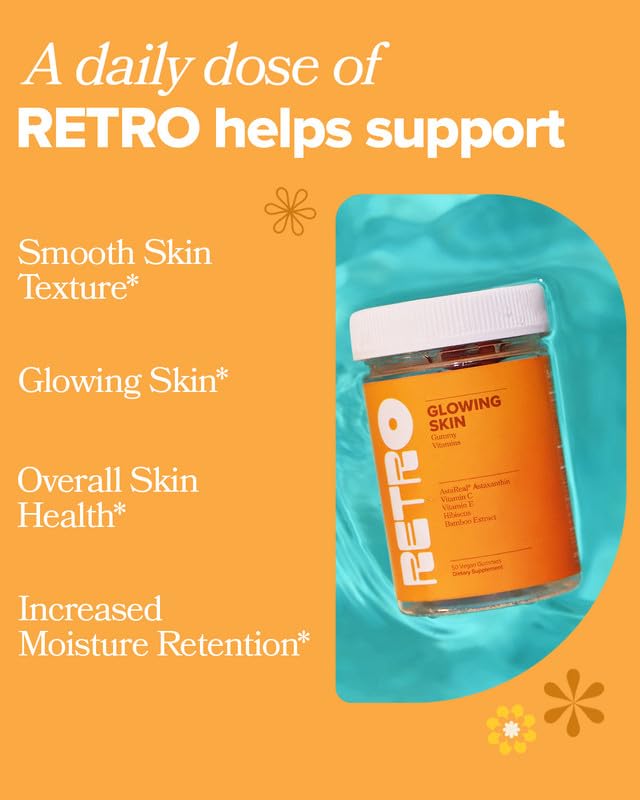 RETRO Gummy Glowing Skin Vitamins for Collagen Production - Astaxanthin, Vitamin E, Bamboo Extract, Hibiscus, & Vitamin C - Vegan Skin Vitamin Gummies for Smooth Skin & Hydration, 50 Count (Pack of 1)