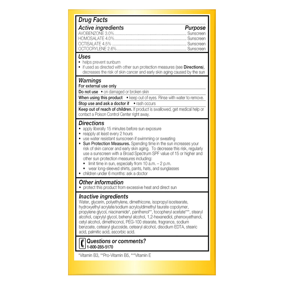 Ingredients :: Active ingredients: Avobenzone 3.0%, Homosalate 4.0%, Octisalate 4.5%, Octocrylene 2.6% Inactive Ingredients: Water, Glycerin, Polyethylene, Dimethicone, Isopropyl Isostearate, Hydroxyethyl Acrylate/Sodium Acryloyldimethyl Taurate Copolymer, Propylene Glycol, Niacinamide, Panthenol, Tocopheryl Acetate, Stearyl Alcohol, Caprylyl Glycol, Behenyl Alcohol, 1.2-Hexanediol, Phenoxyethanol, Cetyl Alcohol, Dimethiconol, PEG-100 Stearate, Fragrance, Sodium Benzoate, Cetearyl Glucoside, Cetearyl Alcohol, disodium EDTA, Stearic Acid, Palmitic Acid, Ascorbic Acid
