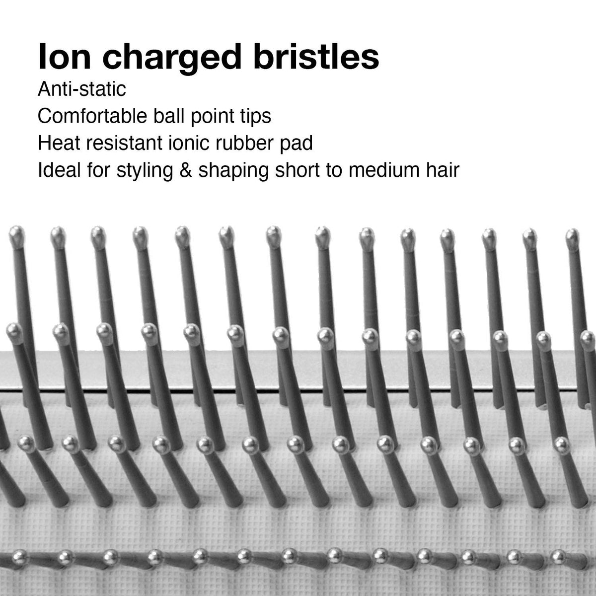 Product Benefit :: Style short to medium hair with anti-static, ion-charged bristles, gentle tips, and ergonomic handle with pick.