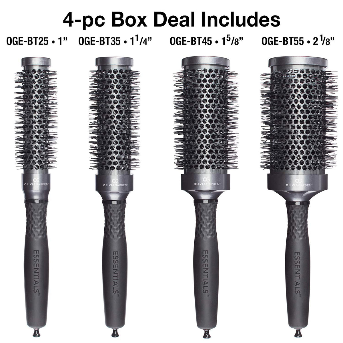 Enhance your styling routine with Olivia Garden ESSENTIALS Thermal 4-pc box deal. This set includes OGE-BT55, OGE-BT45, OGE-BT35, OGE-BT25 brushes in a convenient box. Elevate your hair styling game with these essential tools.