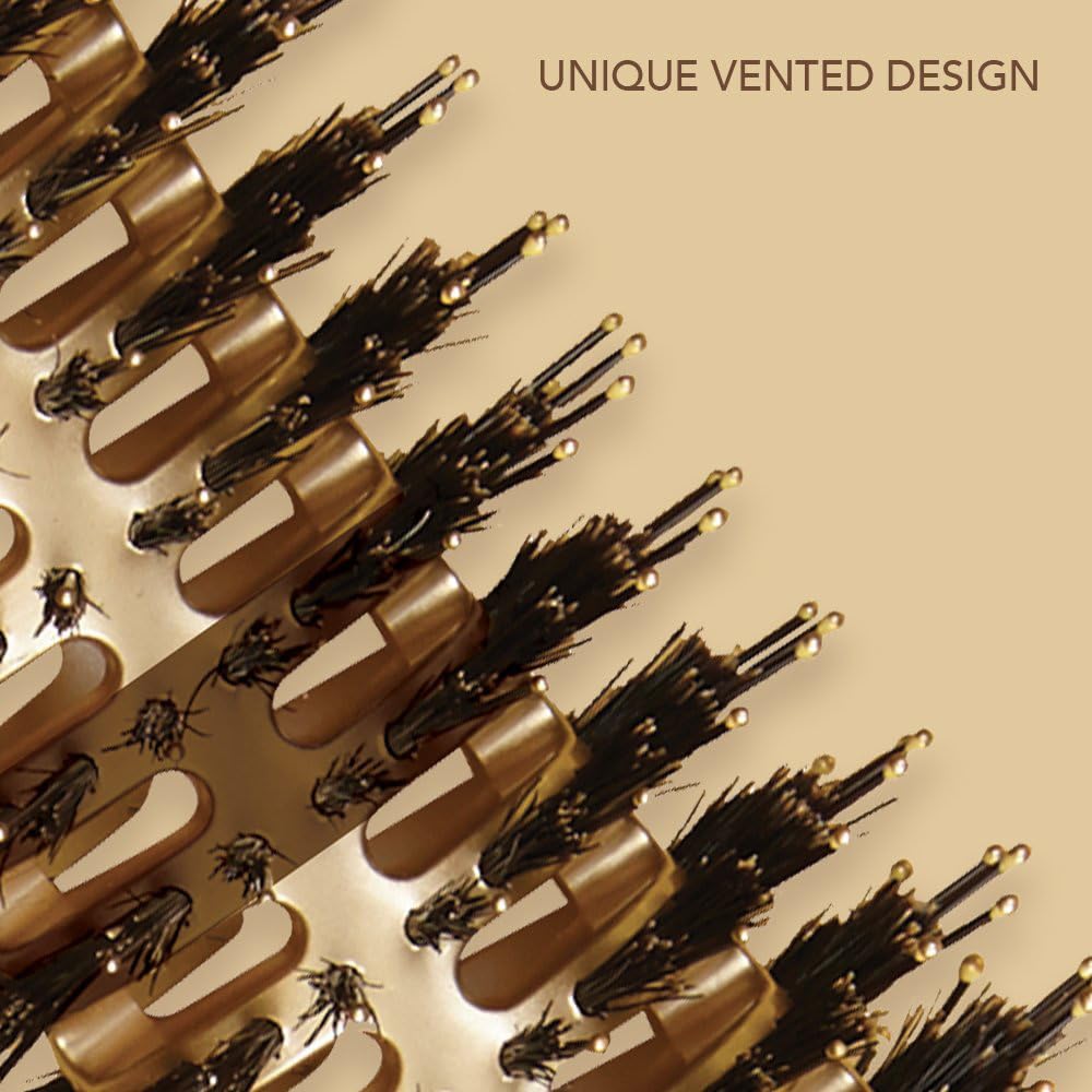 Short Product Description :: Special blend of ionic & 100% boar bristles, allow for ease when drying and styling hair, all lengths & hair types. Its scalp-hugging shape guarantees the brush as close to the scalp as possible guaranteeing a long lasting style