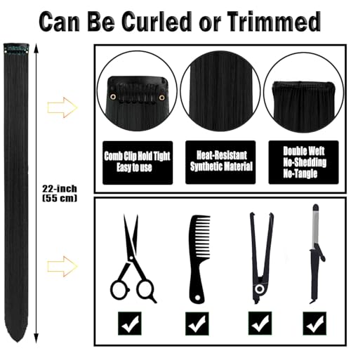 Olldag 12 PCS Black Hair Extensions Clip in, 22 Inch Colored Hair Extensions Party Highlights Long Straight Synthetic Hairpieces for Women Kids Girls