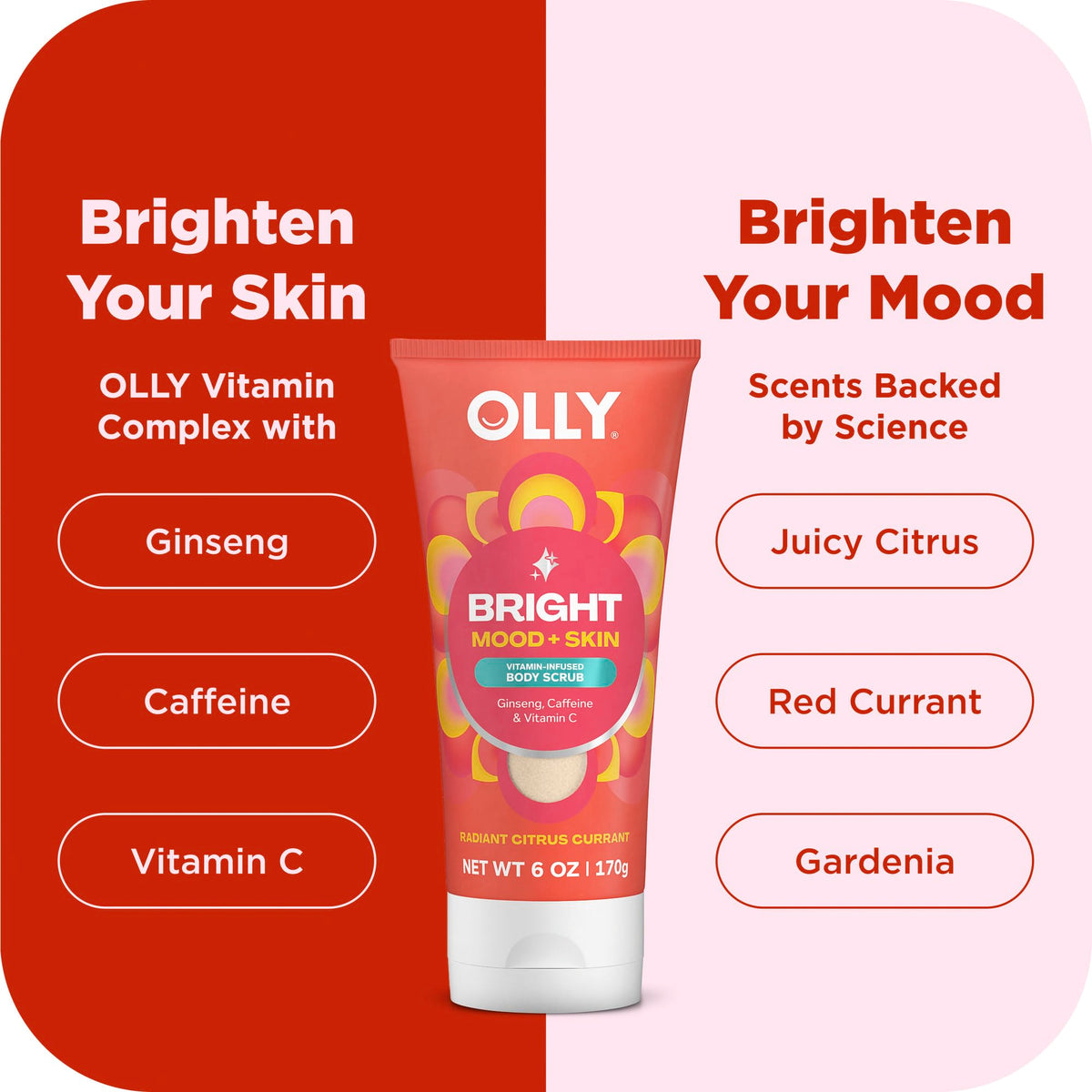 OLLY Bright Body Scrub with Ginseng, Caffeine & Vitamin C– Nourishing Cleanser for Skin Exfoliation, SkinBarrier Repair, Citrus Currant Scent, 6 oz