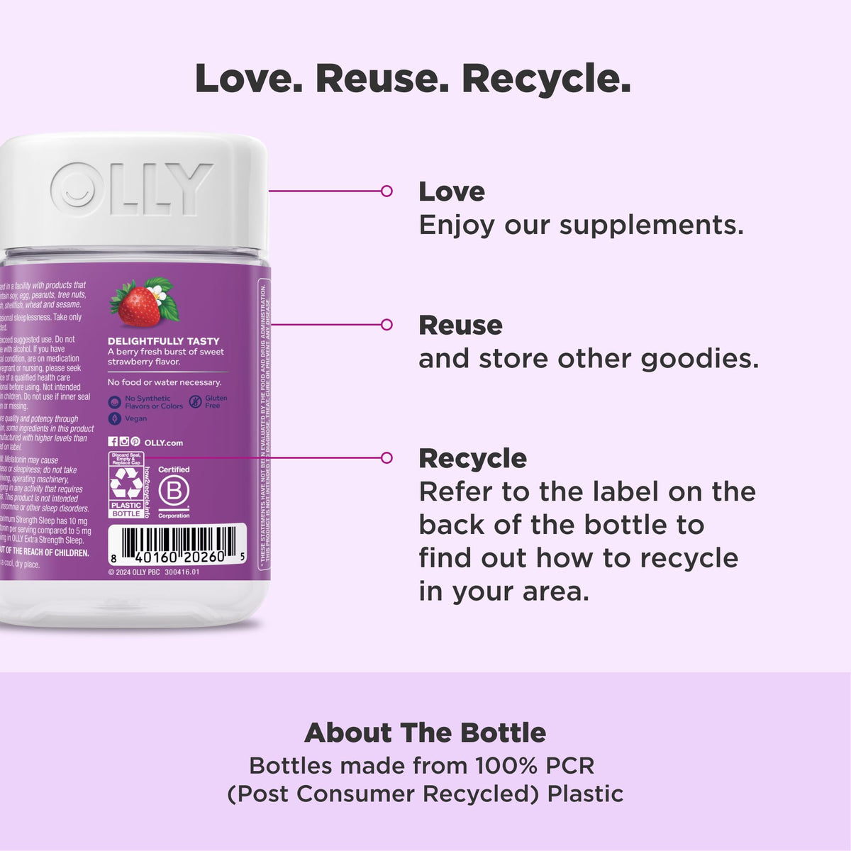 Experience a peaceful night's sleep with OLLY Max Strength Sleep Gummy. Infused with 10mg of Melatonin per 2 gummies, this bedtime essential supports a healthy sleep cycle, aiding you in falling asleep and staying asleep. Unwind your mind with L-Theanine, encouraging relaxation for a restful night. Delight in the blend of Chamomile, Passionflower, and Lemon Balm Extracts for traditional relaxation support.