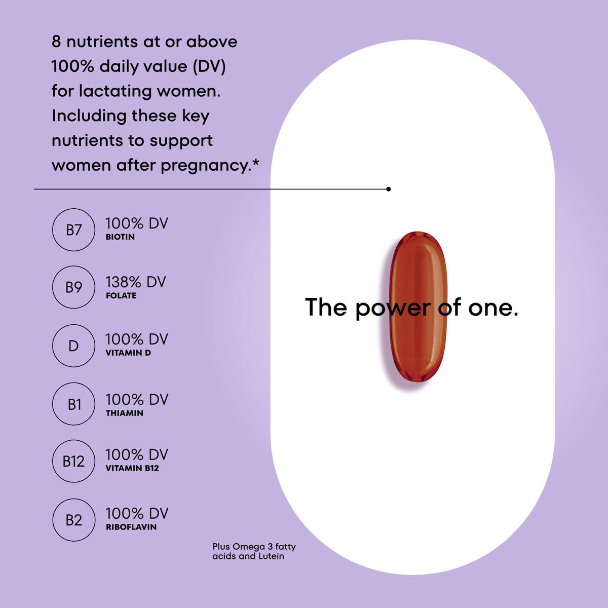 Ingredients :: Vitamin A, as beta-carotene, Vitamin C, Vitamin D, Vitamin E, Thiamin (B1), Riboflavin (B2), Niacin, Vitamin B6, Folate, Vitamin B12, Biotin, Pantothenic Acid, Calcium, Iron, Iodine, Zinc, Omega-3 Fatty Acids, DHA (docosahexaenoic acid), EPA (eicosapentaenoic acid). Gelatin, Glycerin, Yellow Beeswax, Color (Annatto Extract seed), Soybean Lecithin, Sunflower Oil, Water.