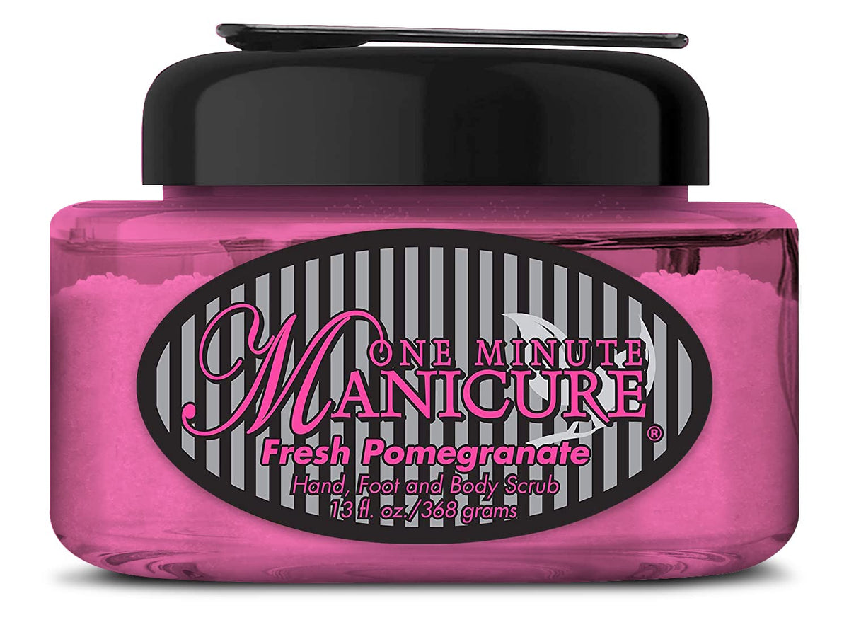 One Minute Manicure Moisturizing Salt Scrub is a professional exfoliating treatment that reconditions and moisturizes your skin. Enjoy the Fresh Pomegranate scent in a 13 oz jar.