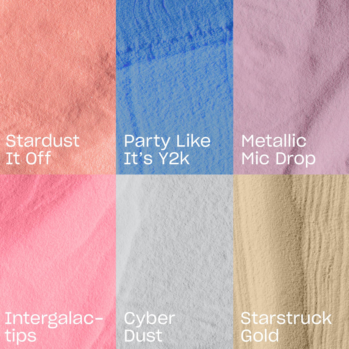 Ingredients :: Ingredients (Cyber Dust): Polyethylmethacrylate, Mica, Aluminum Calcium Sodium Silicate, Silica, Polymethyl Methacrylate, Benzoyl Peroxide, May Contain/Peut Contenir/+/-: Titanium Dioxide (CI 77891), Aluminum Powder (CI 77000), Silver (CI 77820). This product contains silver and/or silver salts. Avoid contact with broken or abraded skin. Ce produit contient de l'argent ou des sels d'argent. Éviter le contact avec la peau abîmée ou éraflée. Ingredients (Intergalactips): Polyethylmethacrylate, Synthetic Fluorphlogopite, Mica, Silica, Benzoyl Peroxide, Polymethyl Methacrylate, Tin Oxide, Triethoxycaprylylsilane, May Contain/Peut Contenir/+/-: Titanium Dioxide (CI 77891), Red 7 Lake (CI 15850), Iron Oxides (CI 77491), Iron Oxides (CI 77499). Ingredients (Metallic Mic Drop): Polyethylmethacrylate, Synthetic Fluorphlogopite, Mica, Polymethyl Methacrylate, Benzoyl Peroxide, Tin Oxide, May Contain/Peut Contenir/+/-: Titanium Dioxide (CI 77891), Ultramarines (CI 77007), Red 7 Lake (CI 15850). Ingredients (Party Like it's Y2k): Polyethylmethacrylate, Mica, Synthetic Fluorphlogopite, Aluminum Calcium Sodium Silicate, Benzoyl Peroxide, Tin Oxide, May Contain/Peut Contenir/+/-: Titanium Dioxide (CI 77891), Ferric Ammonium Ferrocyanide (CI 77510). Ingredients (Stardust it Off): Polyethylmethacrylate, Mica, Silica, Aluminum Calcium Sodium Silicate, Benzoyl Peroxide, Triethoxycaprylylsilane, Tin Oxide, May Contain/Peut Contenir/+/-: Iron Oxides (CI 77491), Iron Oxides (CI 77492), Red 30 Lake (CI 73360), Titanium Dioxide (CI 77891), Red 7 Lake (CI 15850), Yellow 6 (CI 15985). Ingredients (Starstruck Gold): Polyethylmethacrylate, Silica, Synthetic Fluorphlogopite, Benzoyl Peroxide, Mica, Tin Oxide, Triethoxycaprylylsilane, May Contain/Peut Contenir/+/-: Titanium Dioxide (CI 77891), Iron Oxides (CI 77492), Copper Powder (CI 77400).